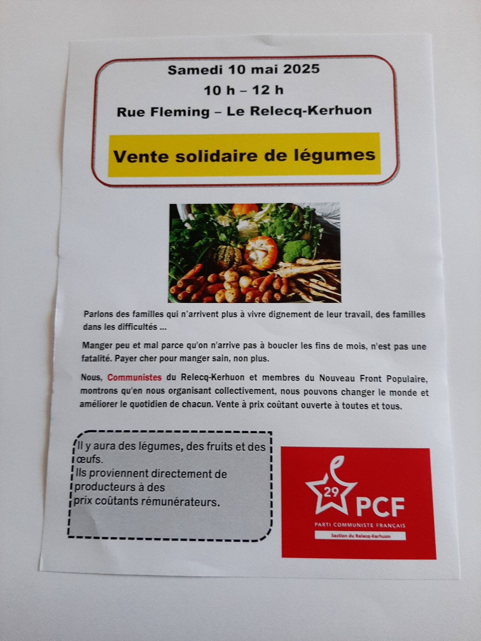 10 mai, 10h-12h: Vente solidaire de légumes rue Fleming au Relecq-Kerhuon par la section PCF