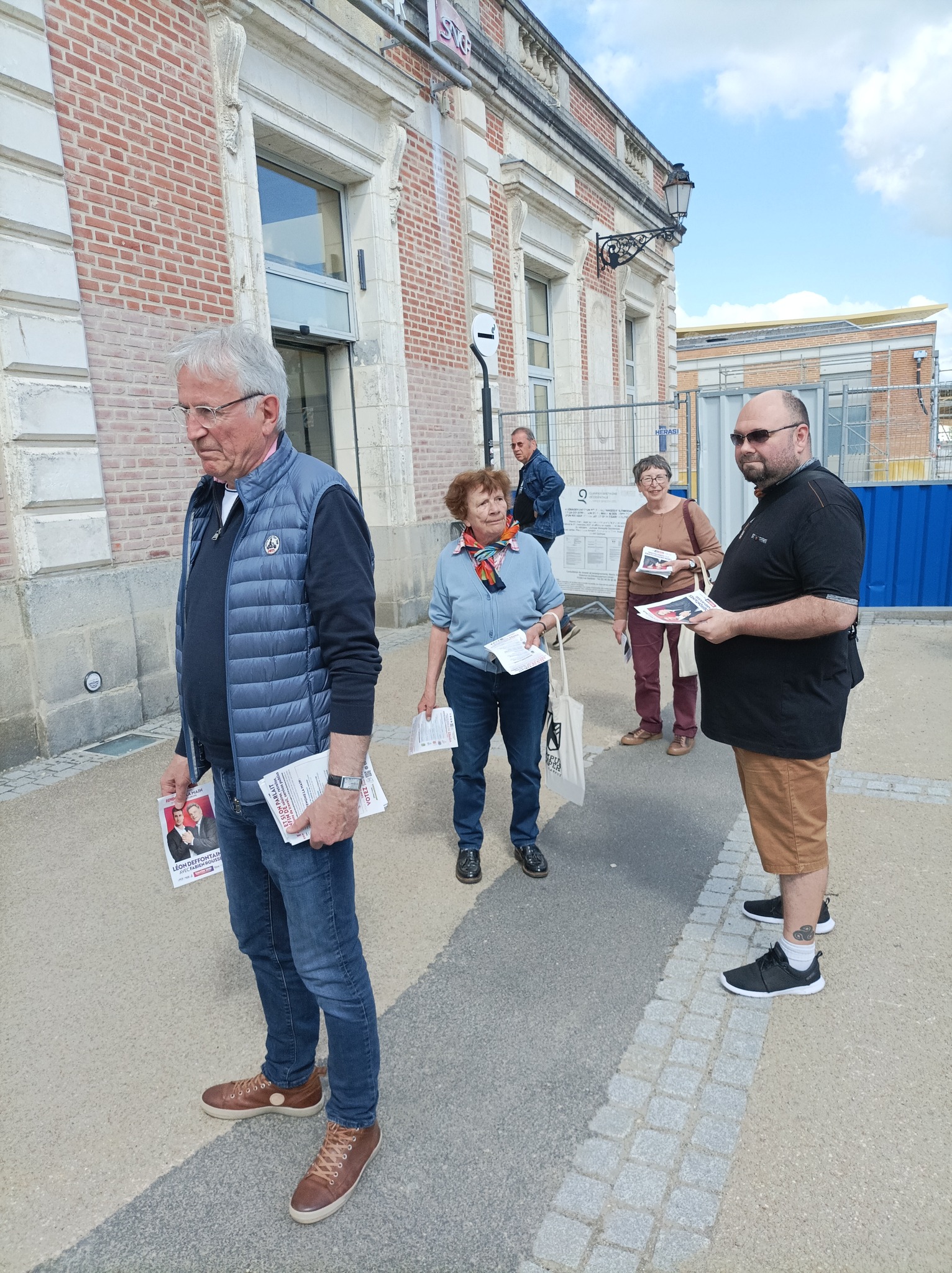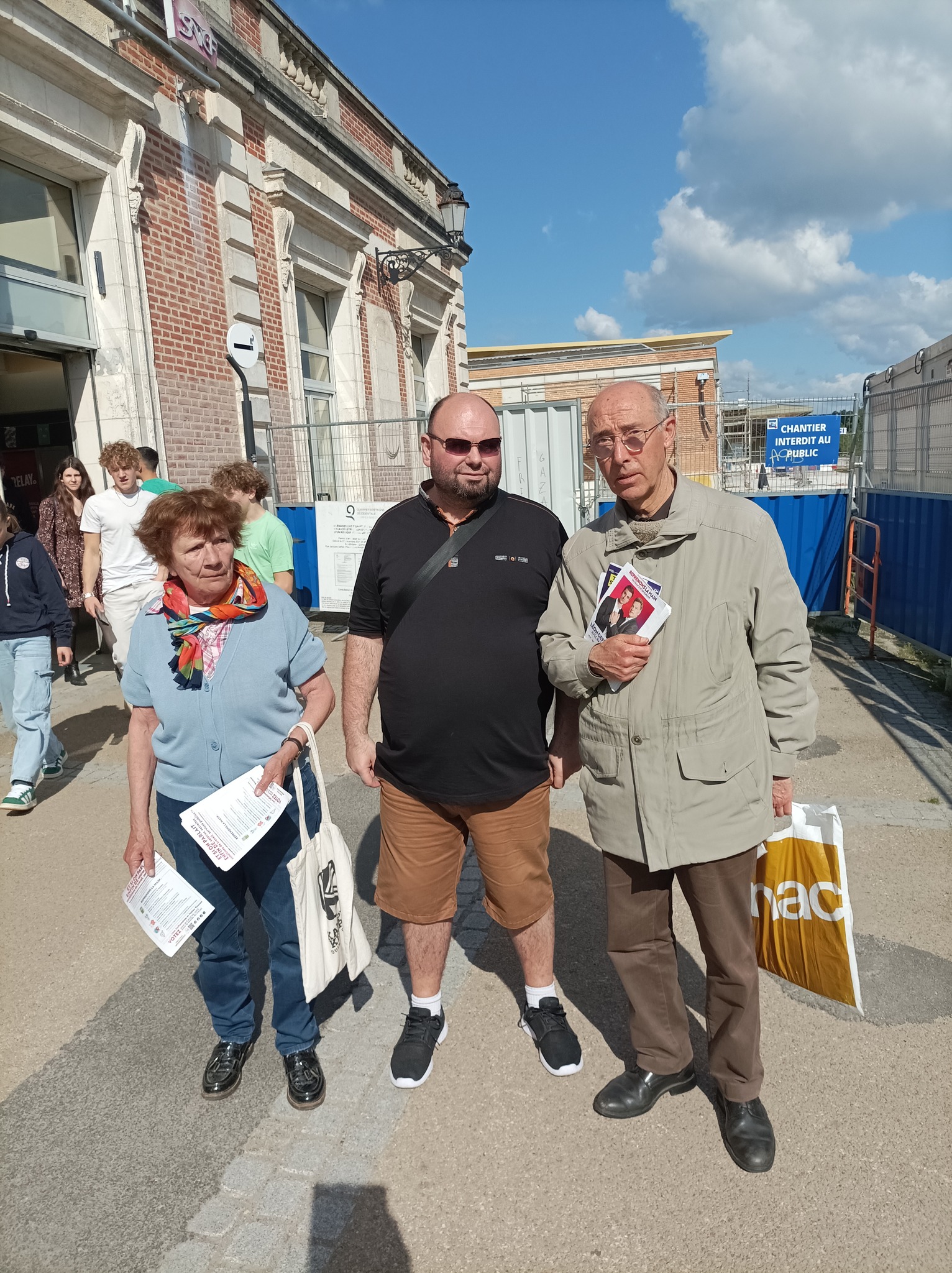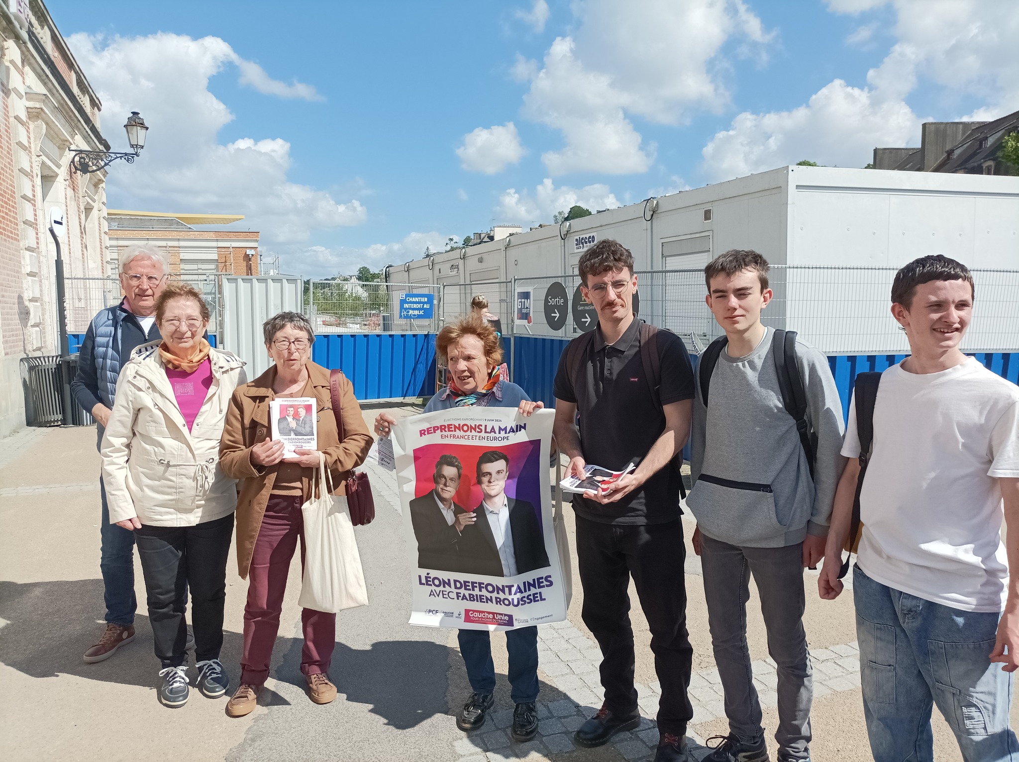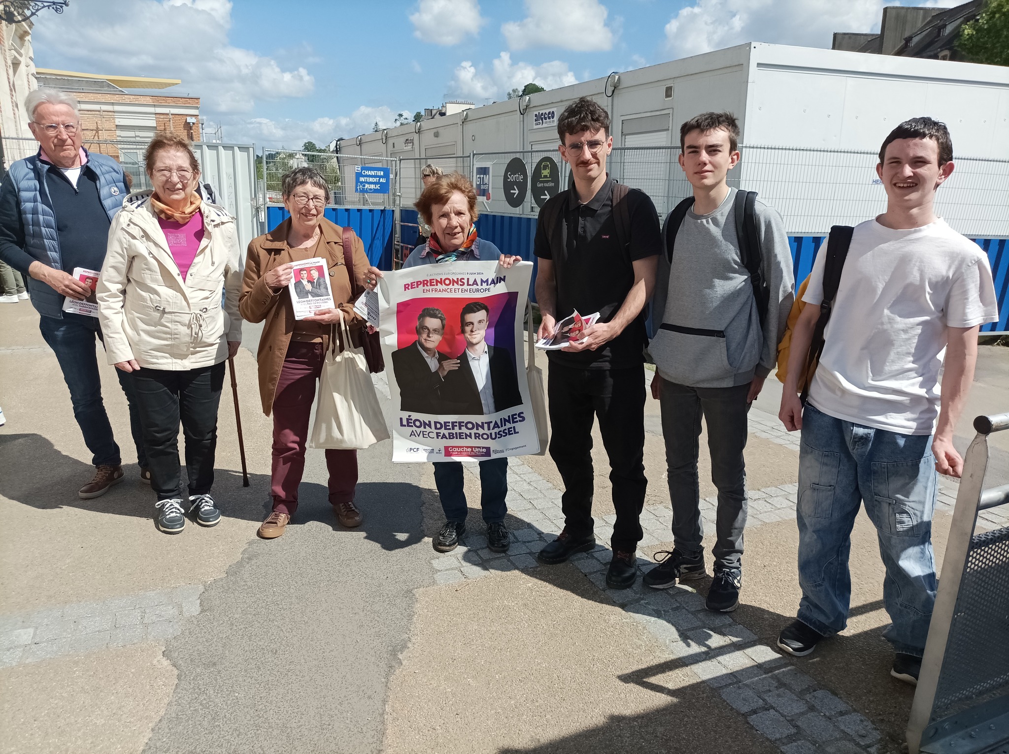 En campagne pour la liste conduite par Léon Deffontaines devant la gare de Quimper ce vendredi 31 mai 2024. Gare en rénovation avec tout son quartier. Temps magnifique, gare très fréquentée en ce vendredi soir. Une douzaine de militants communistes et de JC de Quimper autour de Taran Marec, 25 ans, élu communiste de Brest en charge de la langue bretonne, candidat sur la liste Gauche unie pour le monde du travail. Présence aussi de Nicolas, secrétaire du syndicat des cheminots de Cornouaille, en lutte pour le maintien des accueils physiques de la gare SNCF et de la gare routière de Quimper.