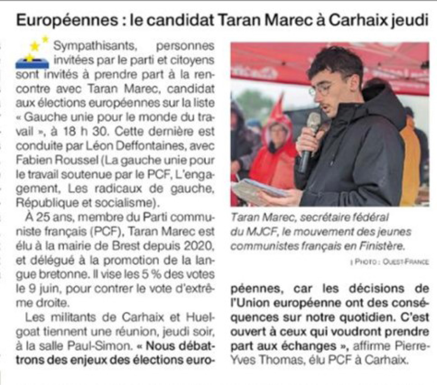 DUPONT Ismaël professeur documentaliste en collège, Conseiller départemental du Finistère, Conseiller municipal délégué et communautaire, secrétaire départemental PCF Finistère, Morlaix