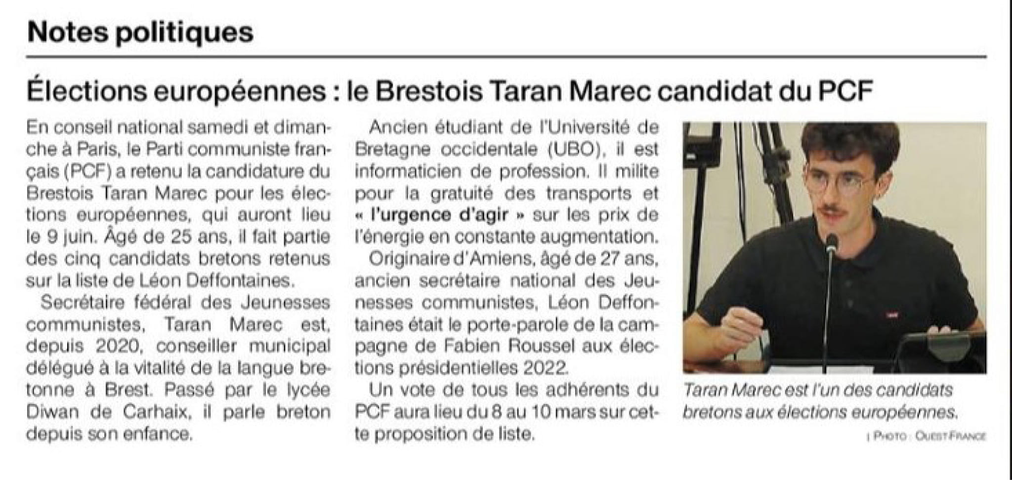 Les élections européennes qui se tiendront le 9 juin prochain avec la liste soutenue par le Parti Communiste Français, conduite par Léon Deffontaines, seront aussi une belle occasion de démontrer que face à l’escroquerie d’extrême droite Jordan Bardella, que face au mirage Gabriel Attal, il existe bien une autre voix, progressiste, capable de transformer la colère en espoir.