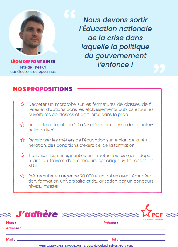 Les élections européennes qui se tiendront le 9 juin prochain avec la liste soutenue par le Parti Communiste Français, conduite par Léon Deffontaines, seront aussi une belle occasion de démontrer que face à l’escroquerie d’extrême droite Jordan Bardella, que face au mirage Gabriel Attal, il existe bien une autre voix, progressiste, capable de transformer la colère en espoir.