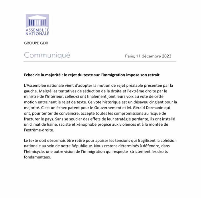 Le vote de la motion de rejet est un signal clair au gouvernement. Il n’a pas de majorité pour voter une telle loi, et il doit la retirer définitivement. Ce texte, tel qu’il est rédigé aujourd’hui, fait de l’étranger le nouveau paria, le pestiféré du XXIe siècle, en lui faisant porter tous les maux de la société. On l’associe à la délinquance et au terrorisme. C’est extrêmement grave.