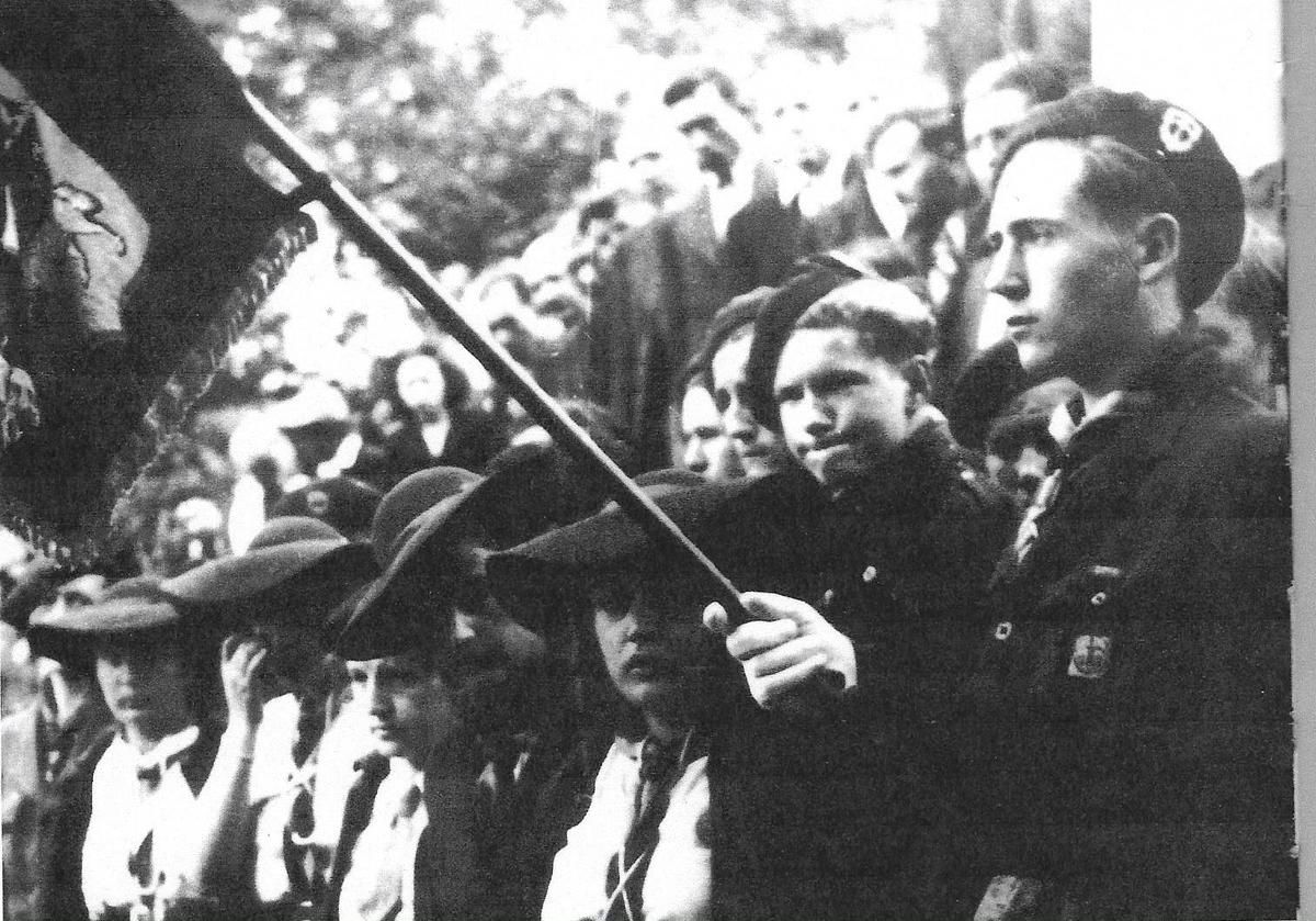 René Vautier, le porteur de drapeau à droite, en 1945. Le scout de Quimper a effectué de nombreuses « missions », l’année où il préparait son bac: c’était lui qui représentait le clan des Eclaireurs lors des cérémonies officielles (collection René Vautier – repris par Philippe Chapleau et l’équipe du livre « Des enfants dans la Résistance », Ouest-France)