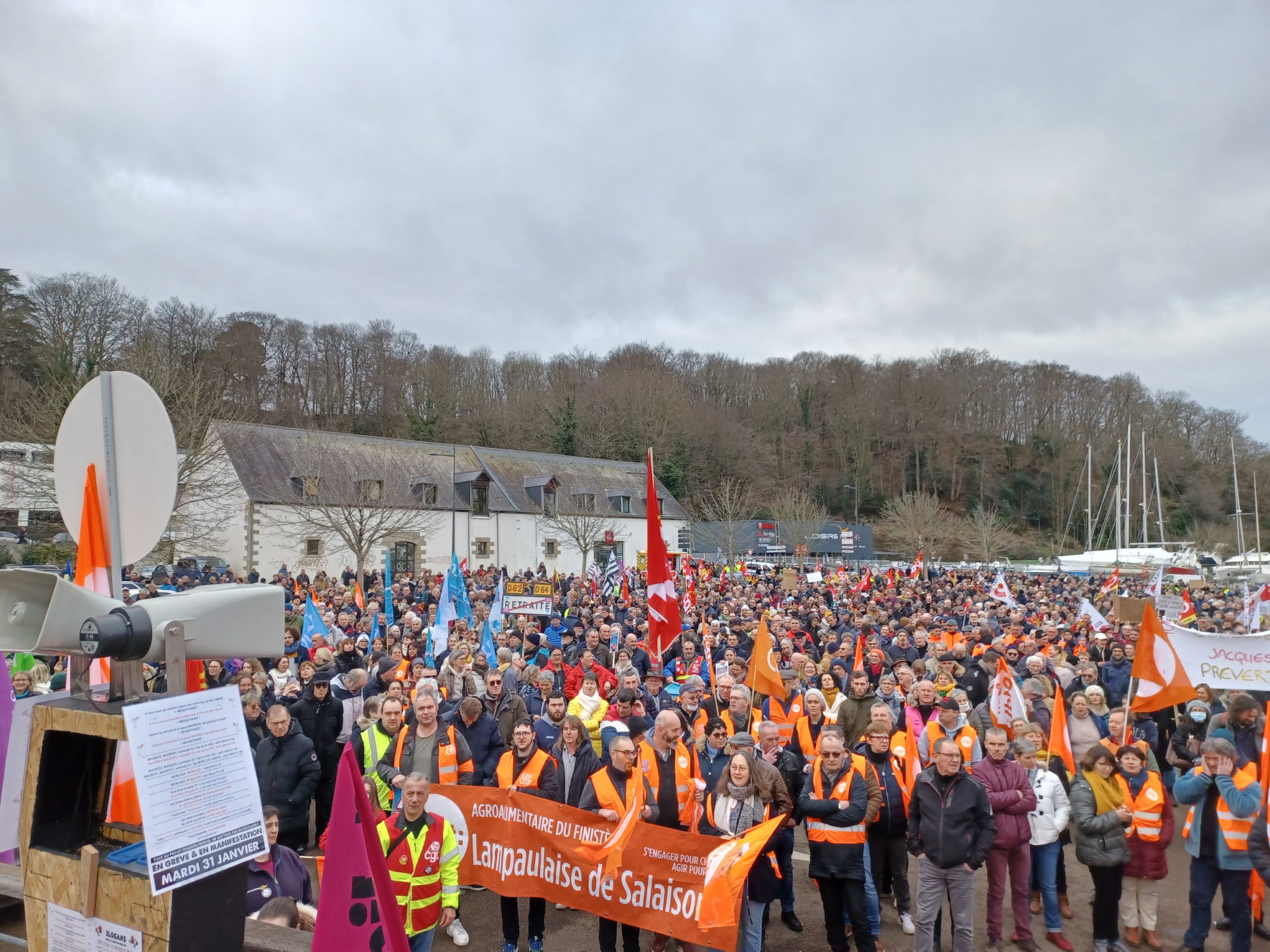 Le programme après ces prises de parole, c’est de partir tout de suite dans les rues de Roscoff derrière la Banderole commune du collectif selon un trajet que nous avons étudié avec le Collectif et la Municipalité, connu par la gendarmerie, et de revenir ensuite vers 16h – 16h15 pour nous retrouver salle Mathurin Méheut pour une collation, un temps d’échange et et de prises de parole complémentaires, jusqu’à 7h-17h30.