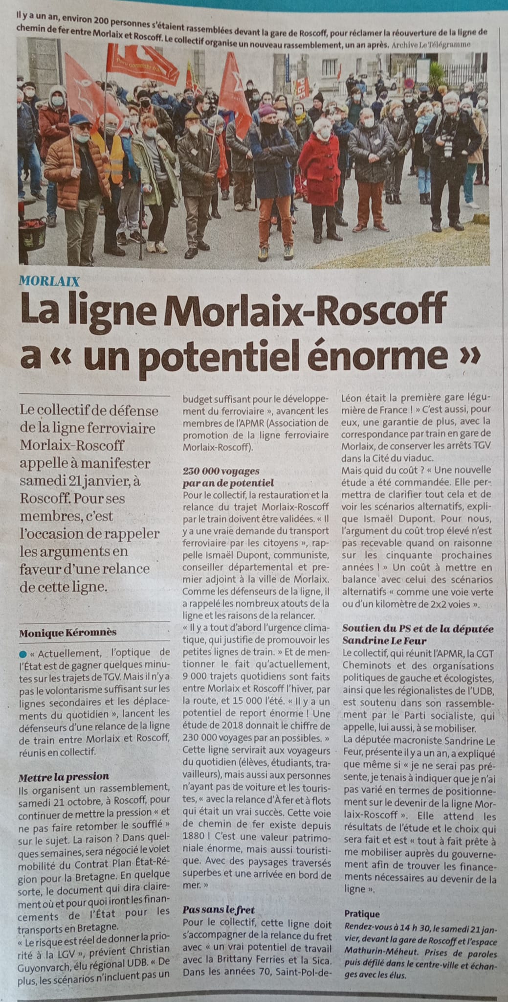 Nous avons invité aujourd’hui la population du pays de Morlaix, Saint-Pol-de-Léon, Roscoff, et tous les défenseurs du ferroviaire et des lignes ferroviaires de proximité, les élus et acteurs économiques du territoire à se mobiliser nombreux pour la relance de la ligne Morlaix-Roscoff