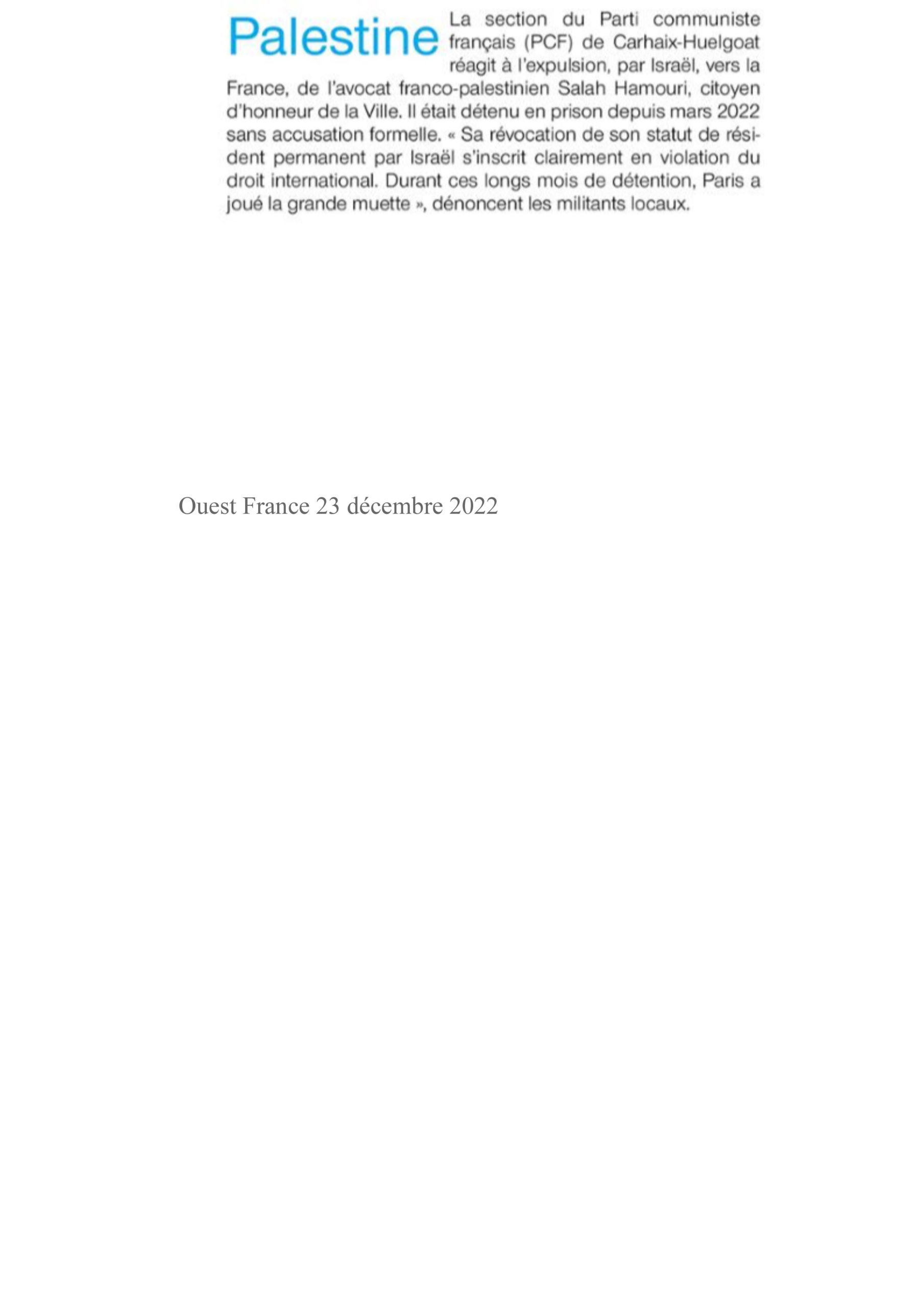 Un autre appel avait été signé en octobre-novembre 2021 par près de 120 élus bretons pour empêcher l’expulsion de Salah Hamouri de Jérusalem en 2021: