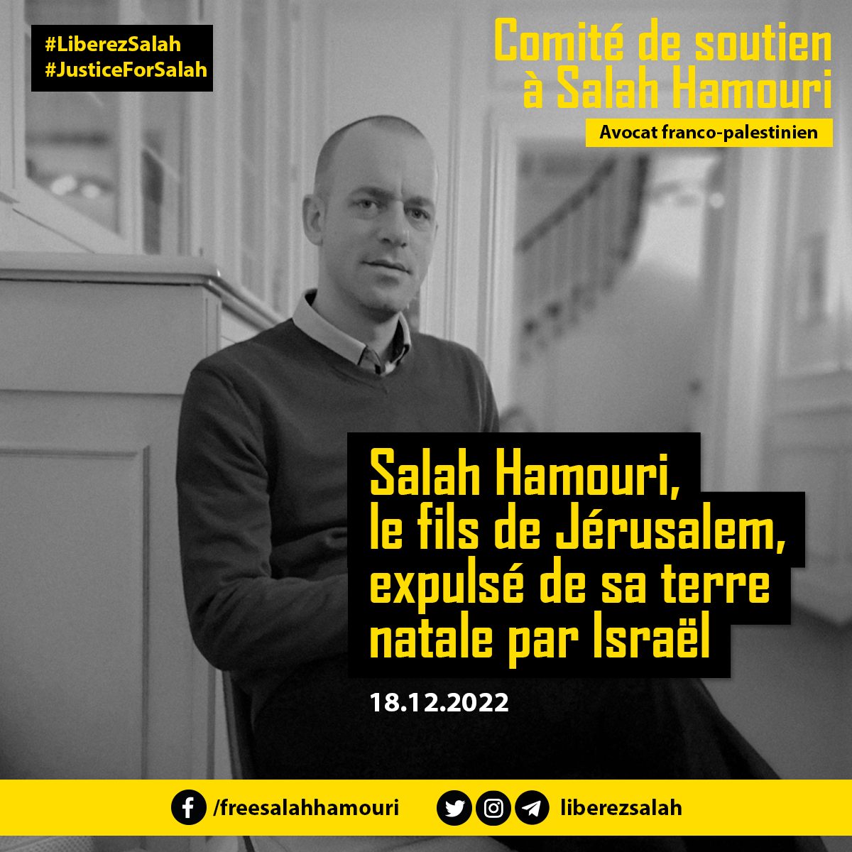 Le lundi 18 octobre Monsieur Salah Hamouri, citoyen français demeurant à Jérusalem-Est s’est vu notifier par les autorités israéliennes d’occupation la révocation de son statut de résident dans cette ville où il est né, de père palestinien et de mère française. Il bénéficie par conséquent d’une double nationalité.