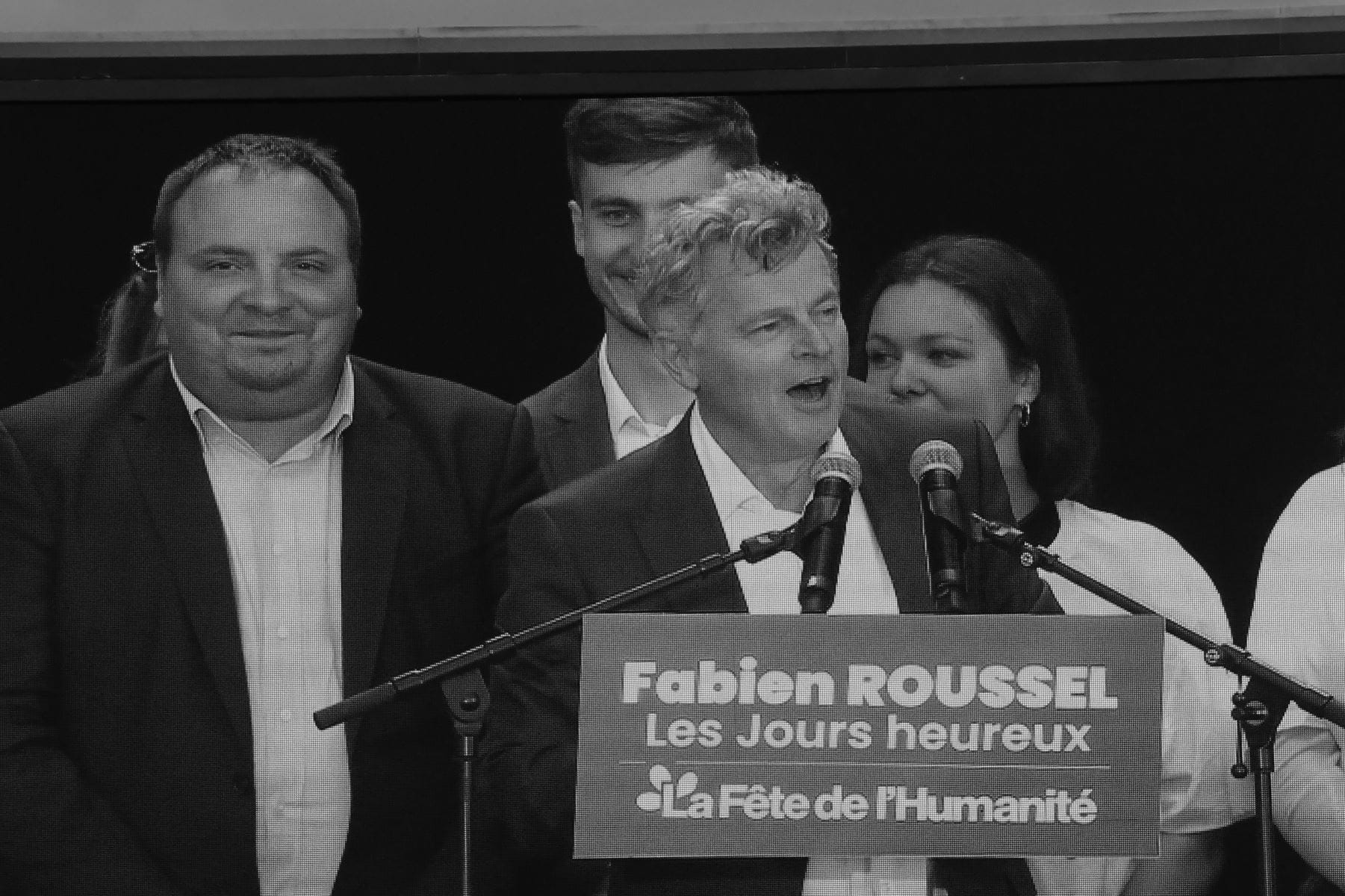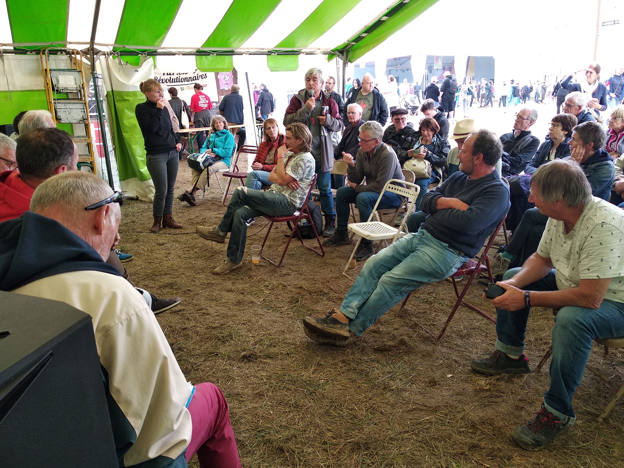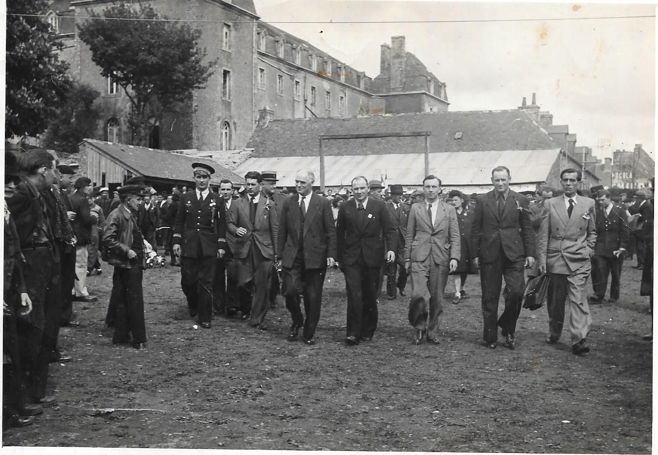 Une photo prise au milieu de la foule sur le stade de Carhaix en 1945, près de l’emplacement actuelle des « Vieilles Charrues ». Cette photo appartient à la collection privée de Jean-Claude Cariou. Au dos, on y trouve un tampon du service du ministère de l’Air. De gauche à droite, on peut voir avançant au milieu de la foule un officier de l’armée de l’air, Charles Tillon, Alain Cariou, résistant communiste, vice-président du Comité Départemental de Libération, chargé de l’épuration des fonctionnaires, permanent du PCF jusqu’en 1947 avant de reprendre ses fonctions d’instituteur, Gaby Paul, député PCF de Brest, membre du Comité Départemental de Libération, un élu (le maire de Carhaix), et sans doute le secrétaire de Charles Tillon et un membre du cabinet (légende Jean-Claude Cariou)