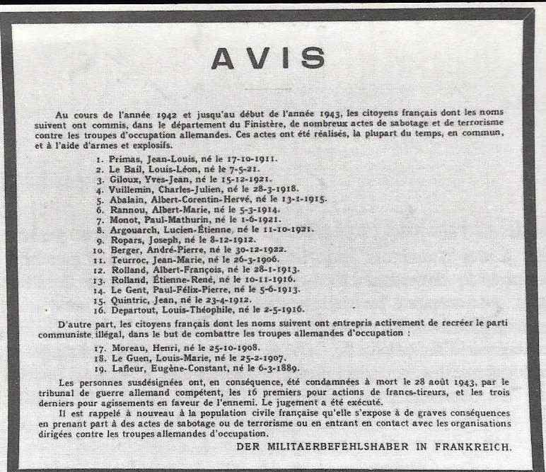 Des connaissances de la résistance d’Alain Cariou vont participer à cacher un groupe de résistants transportés depuis Concarneau à destination de l’Angleterre et dont le bateau s’était échoué sur la côte près du port de Bestrée: et parmi eux Pierre Brossolette. Guillaume Le Brun, cafetier et résistant de Plogoff, Aimé Kerisit de Goulien et d’autres sont venus leur prêter secours.