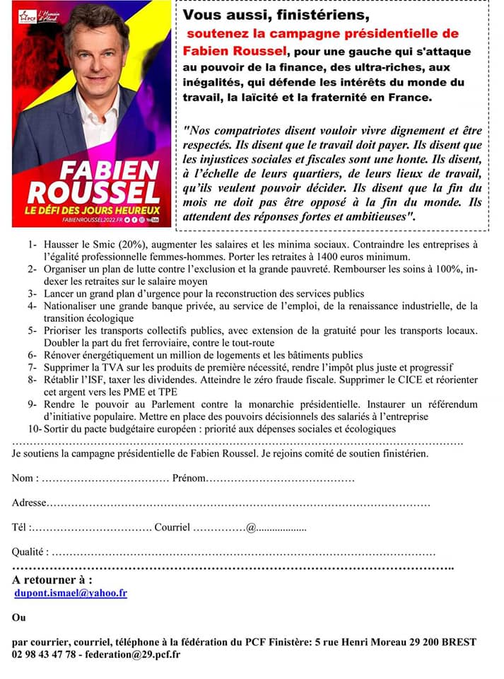 Si vous voulez vous inscrire sur le comité de soutien finistérien à Fabien Roussel, envoyez un mail à: dupont.ismael@yahoo.fr