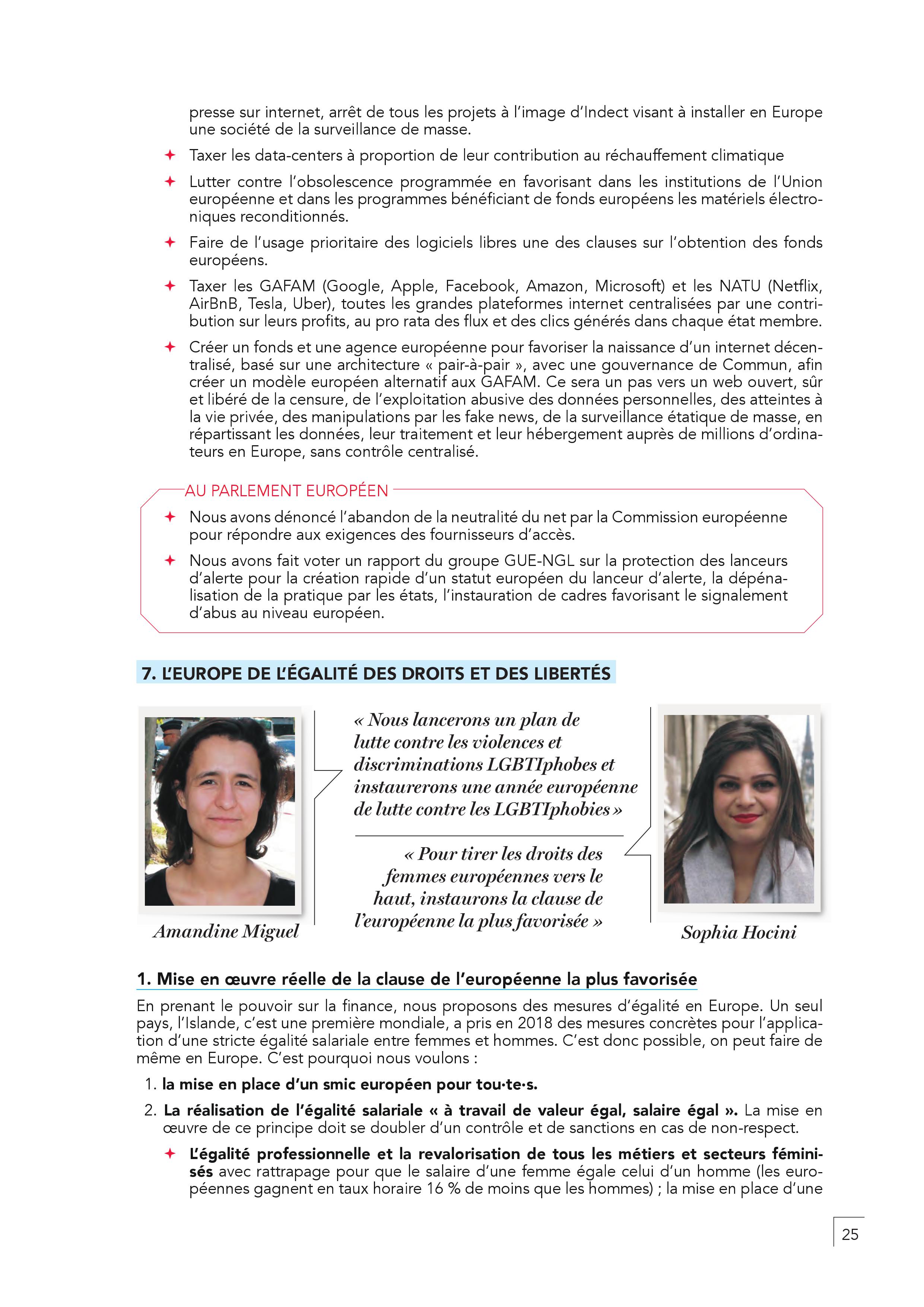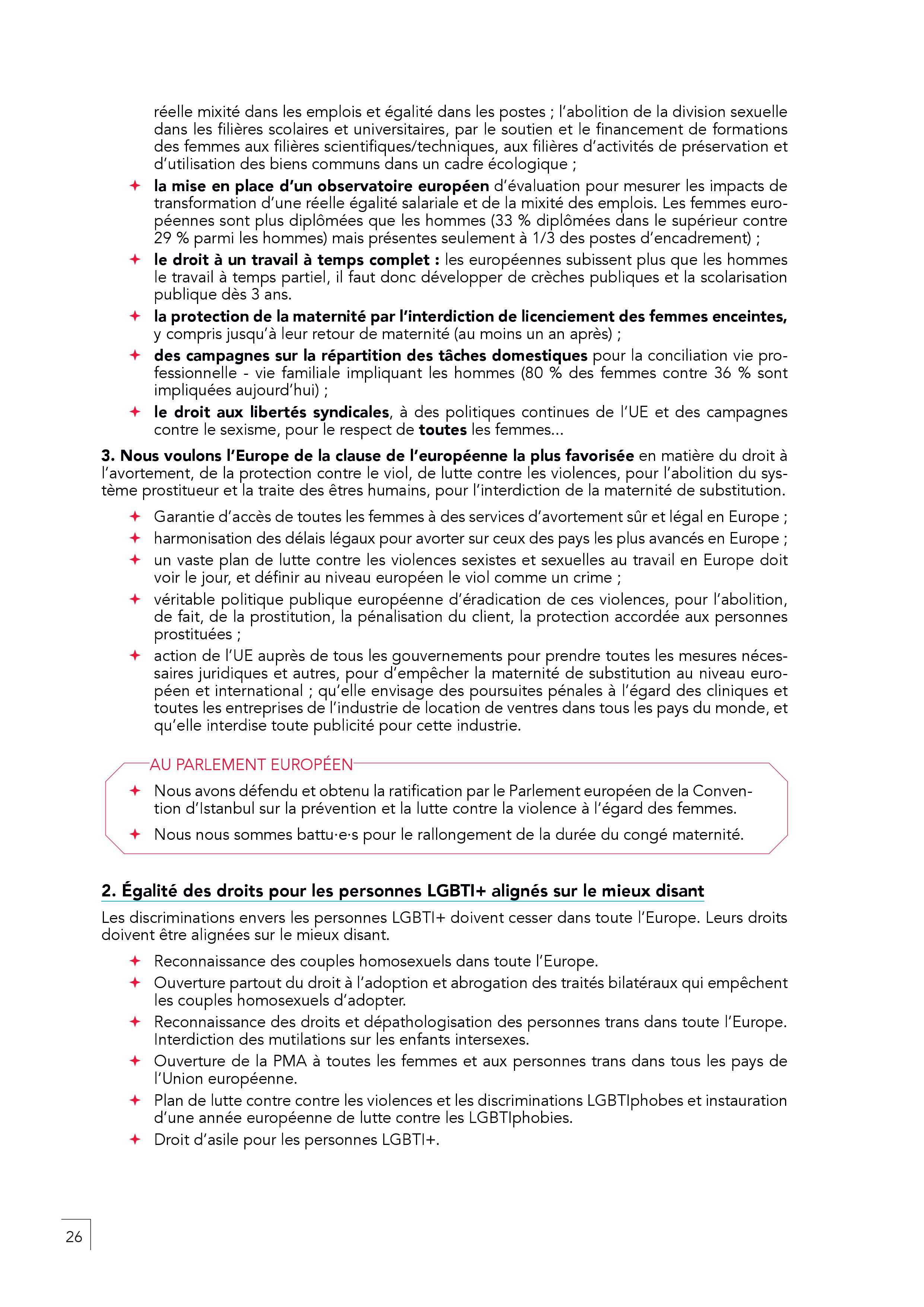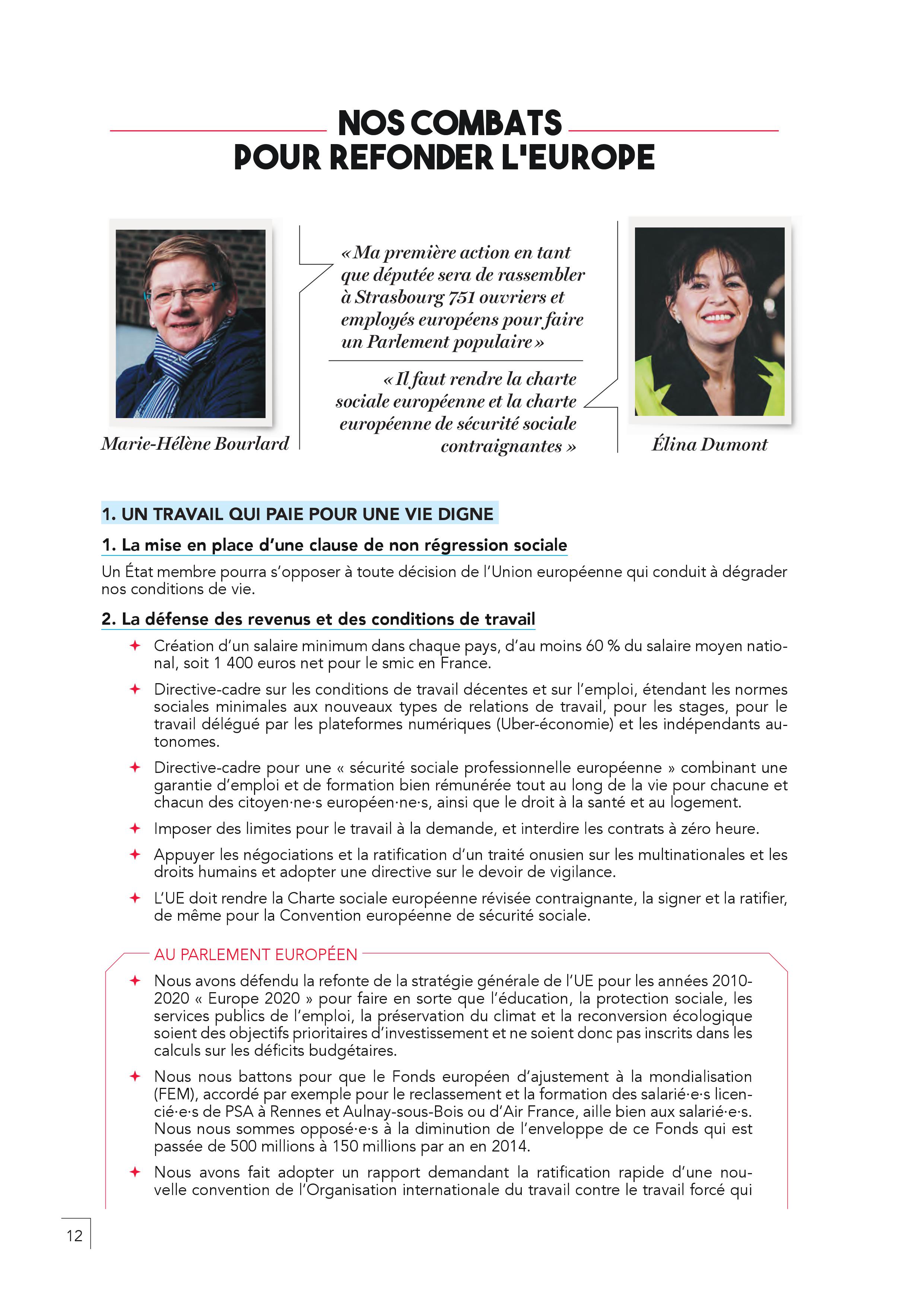 – Un salaire minimum européen établi à au moins 60% du salaire moyen net d’un pays (1400 euros net en France) et l’égalité professionnelle femme-homme.