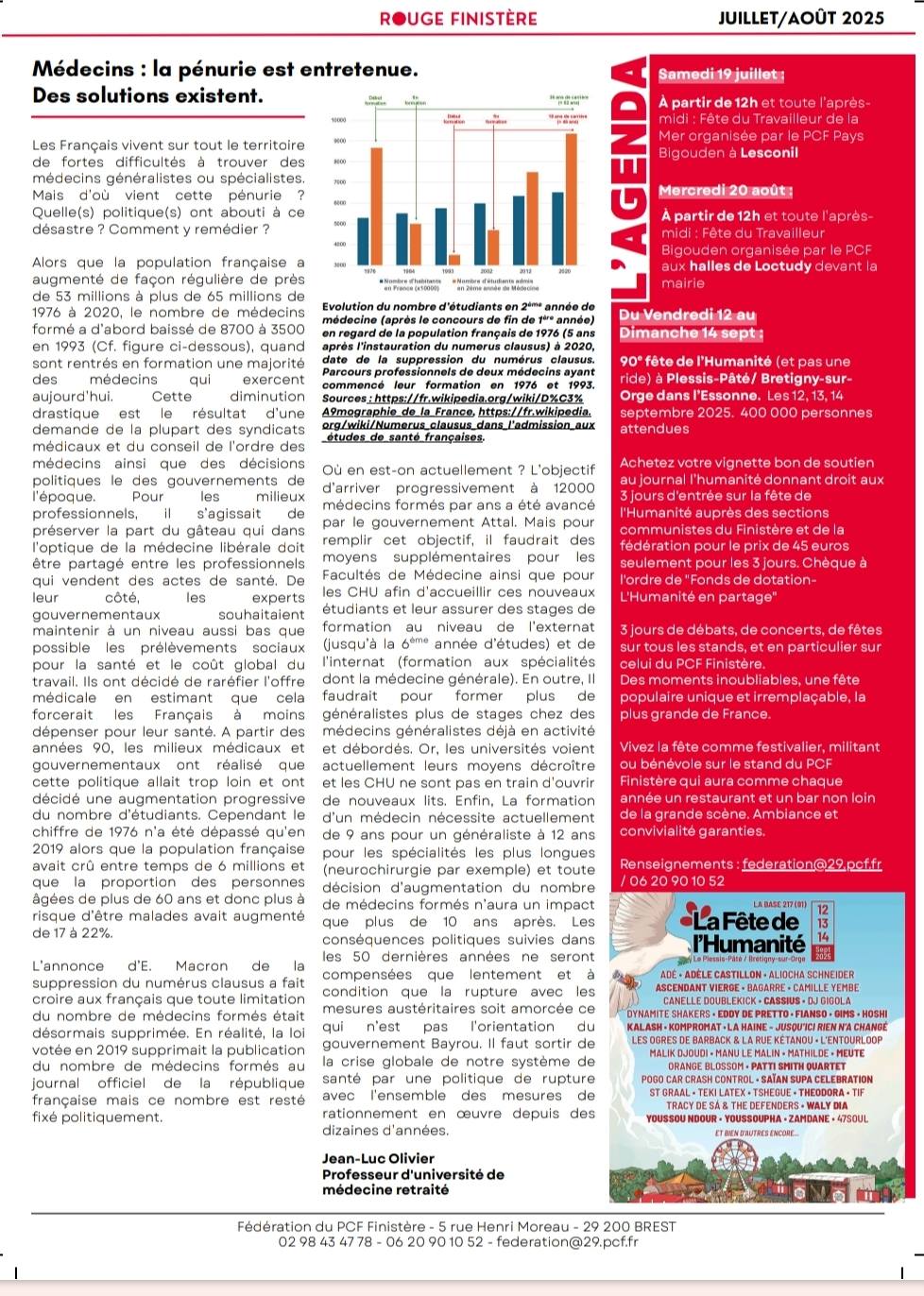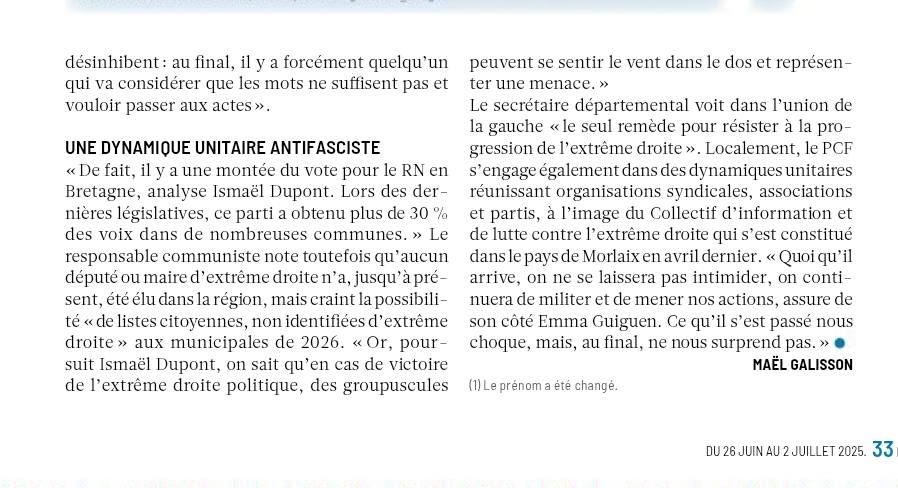 Depuis 1936, nous cultivons l’union des forces progressistes face à la menace, jamais aussi prégnante, tant au niveau national qu’international qu’est le fascisme représenté par l’extrême droite et la droite extrême. C’est pour cette raison que nos camarades du Nouveau Front Populaire du Pays Bigouden sont présents. Notre volonté commune de créer une union à la base est le sentiment qui nous anime au quotidien, sentiment partagé au- delà des partis politiques, car il rassemble tous les citoyens de gauche et écologistes. C’est bien sur le terrain, dans la rue et dans les urnes qu’il faut mener les luttes contre l’extrême droite, le capitalisme et les guerres dans le monde. Sans l’apport de la société civile et des corps intermédiaires, que sont les organisations syndicales, cette volonté de fédérer ne serait pas optimale. Leur présence ce jour répond à cette dynamique conjointe. Merci aux camarades de la CGT, que nous vous invitons à rencontrer à notre fête, mais aussi dans vos entreprises et lieux de travail. Sous le barnum du PCF, vous trouverez la revue « rouge Finistère » mais d’autres lectures également et nos camarades pour prolonger le débat Sous le barnum du NFP quelques exemplaires de la gazette et des militants pour vous accueillir. Je vous invite également à signer la pétition contre la loi Duplomb sur le site de l’AN qui a déjà réuni plus des centaines de milliers de signatures en quelques jours.