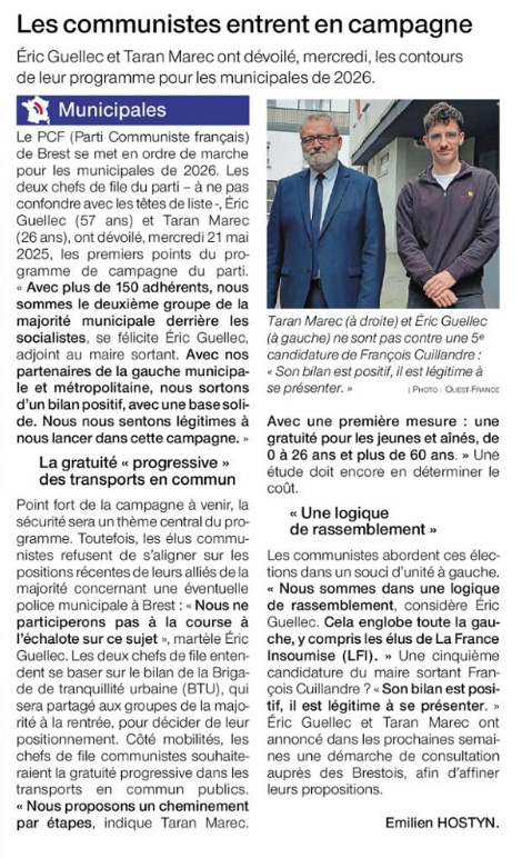 Les communistes abordent ces élections dans un souci d’unité à gauche. « Nous sommes dans une logique de rassemblement, considère Éric Guellec. Cela englobe toute la gauche, y compris les élus de La France Insoumise (LFI). » Une cinquième candidature du maire sortant François Cuillandre ? « Son bilan est positif, il est légitime à se présenter. » Éric Guellec et Taran Marec ont annoncé dans les prochaines semaines une démarche de consultation auprès des Brestois, afin d’affiner leurs propositions.