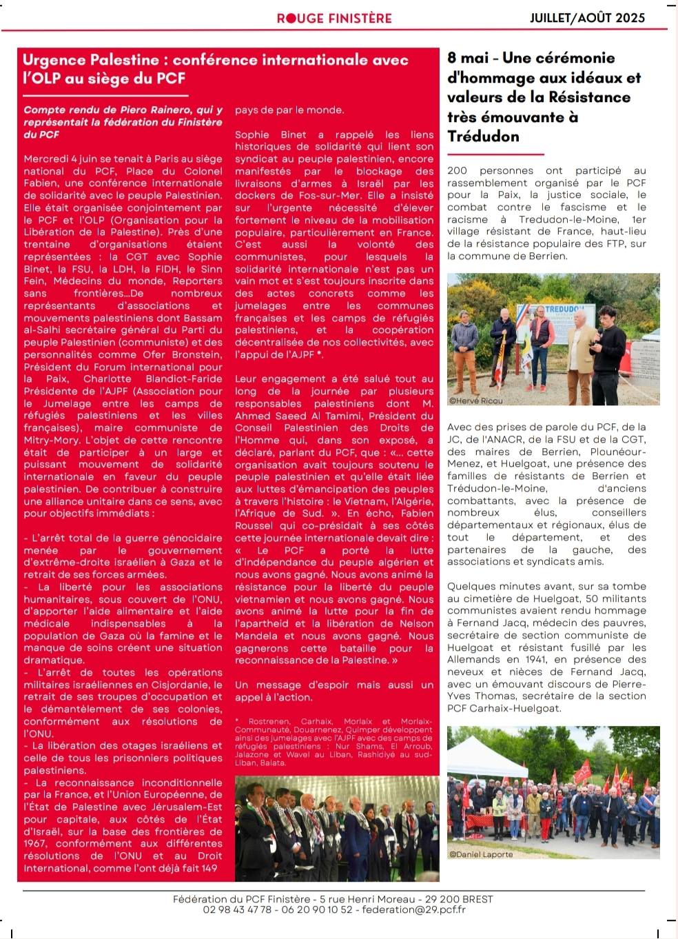 Le 17 mai, nous étions encore mobilisés à l’occasion des 77 ans de la Nakba pour exprimer notre solidarité avec le peuple palestinien et exiger la fin du génocide à Gaza et du nettoyage ethnique en Cisjordanie dans les manifs organisées à Brest, Quimper, Morlaix, Carhaix, Pont l’Abbé, Douarnenez, etc, et les communistes comme chaque fois étaient présents dans ces manifestations.