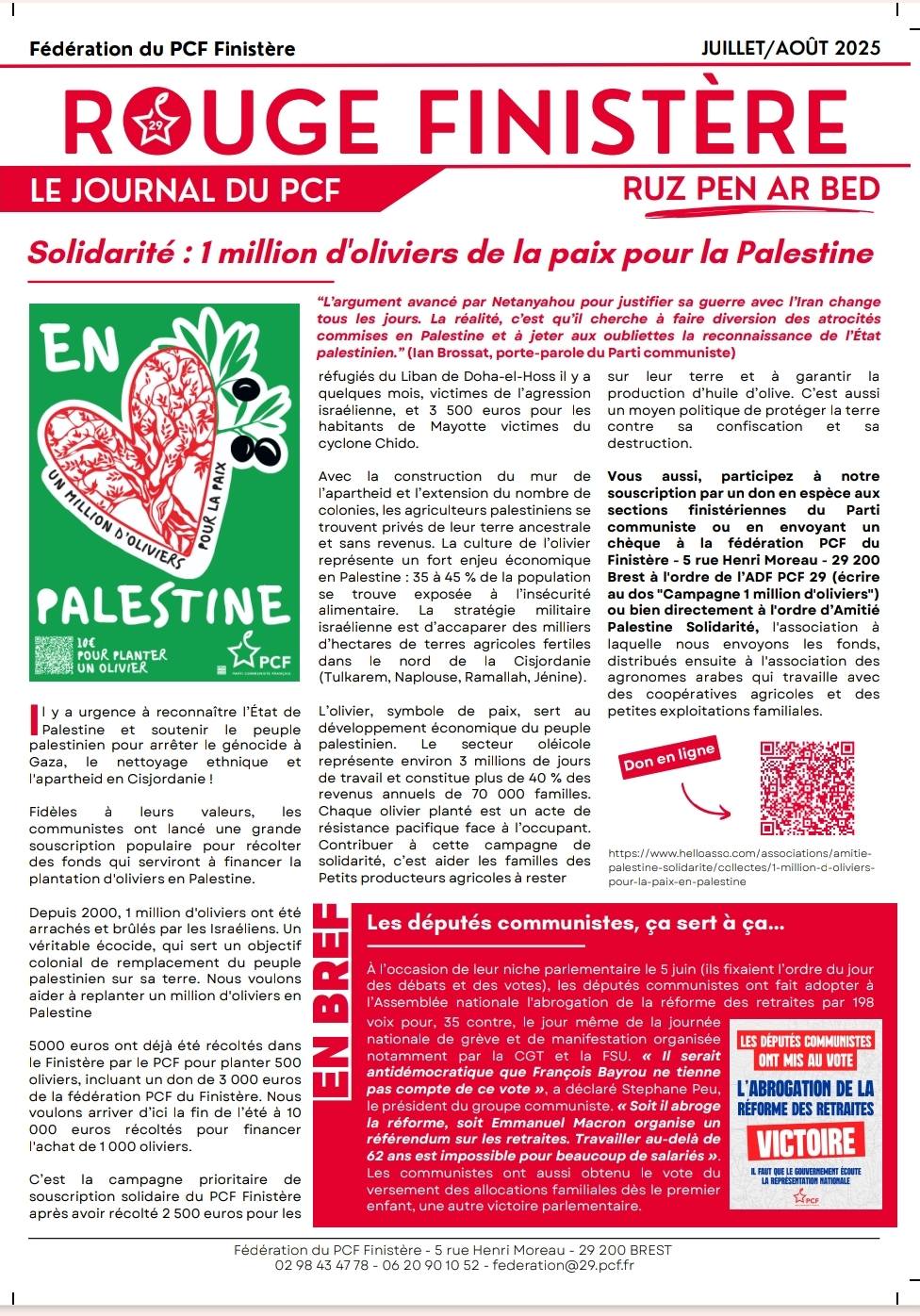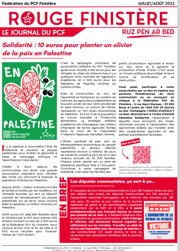 La fédération du Finistère du PCF qui a déjà versé il y a quelques mois 3500 euros au Secours Populaire pour Mayote suite au cyclone Chido et 2500 euros aux réfugiés au Liban, victimes de l’agression israélienne, dans la ville de Doha el Hoss près de Beyrouth, souhaite cette fois-ci réunir 10 000 euros et fait de sa part immédiatement un don de 3000 euros pour planter 300 oliviers en Palestine au mois de novembre-décembre.