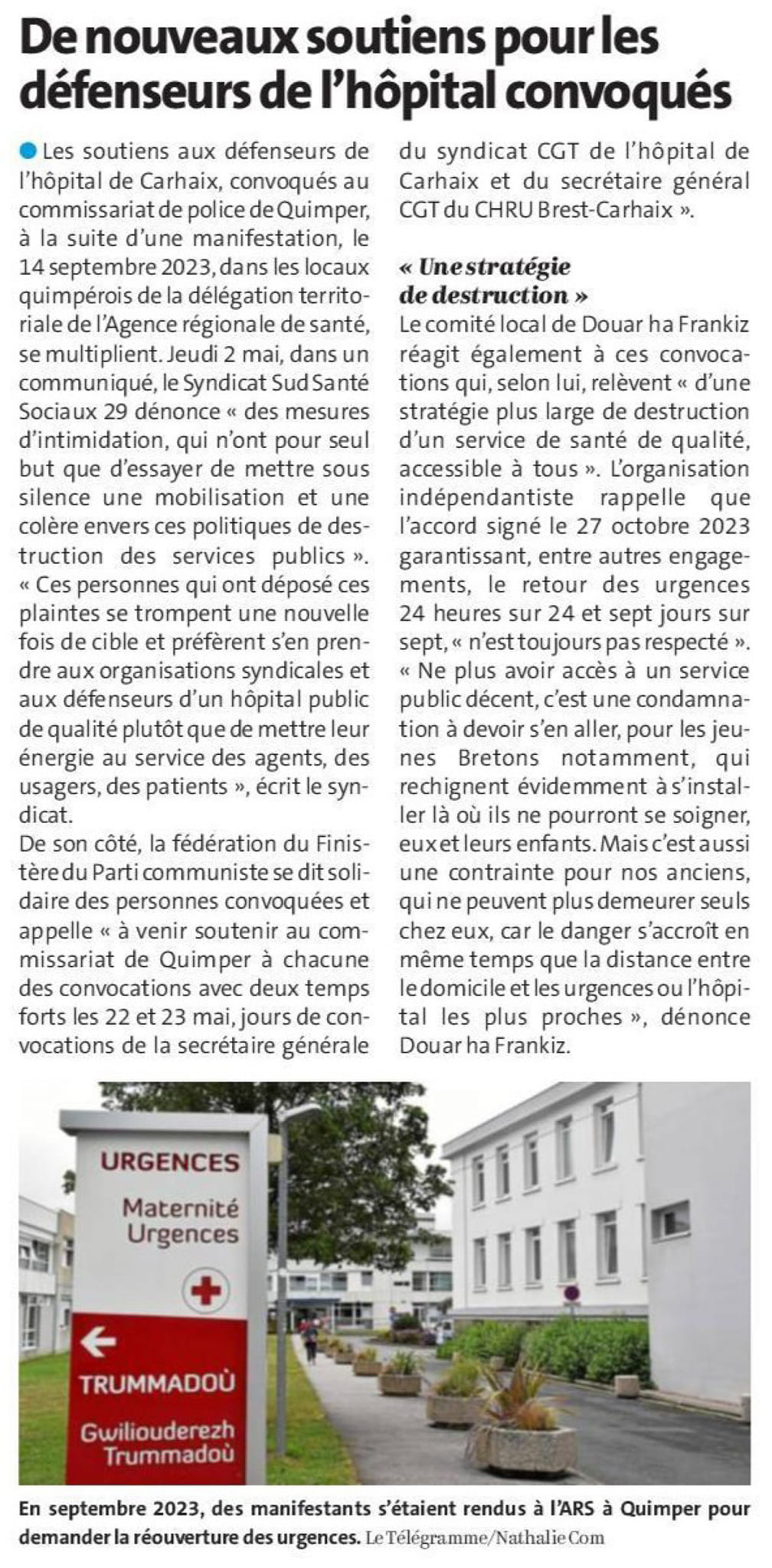 Carhaix – De nouveaux soutiens pour les défenseurs de l’hôpital convoqués (Le Télégramme, 2 mai 2024)