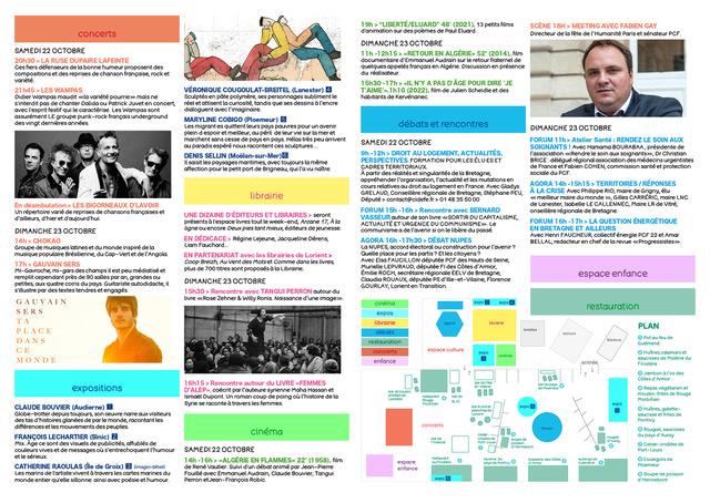 Dimanche 23 octobre, 14h- Débat avec Gilles Carreric, le maire de Lanester, Isabelle Le Callennec, maire de Vitre et conseillère régionale, cheffe de file de la droite LR aux dernières régionales, Ismaël Dupont, premier adjoint à Morlaix et conseiller départemental PCF, remplaçant Philippe Rio, Maire de Grigny, et Philippe Jumeau l’animateur du débat, secrétaire départemental du PCF Morbihan, porte parole du comité régional PCF et adjoint au maire a Lanester.