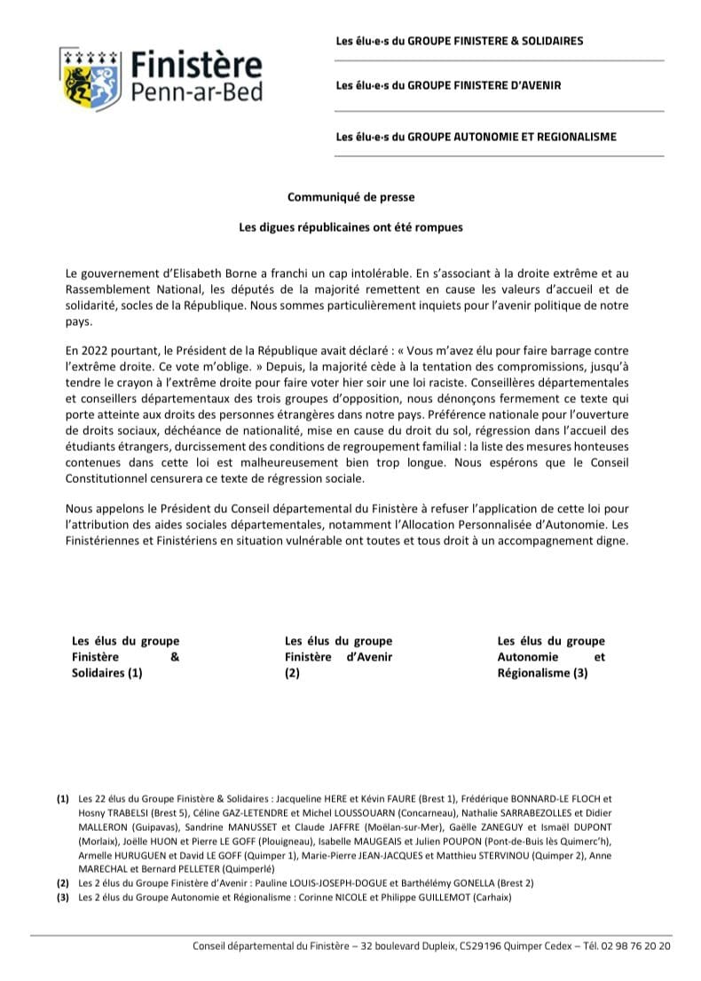 Communiqué des groupes d’opposition de gauche au Département: Loi immigration, les digues républicaines ont sauté