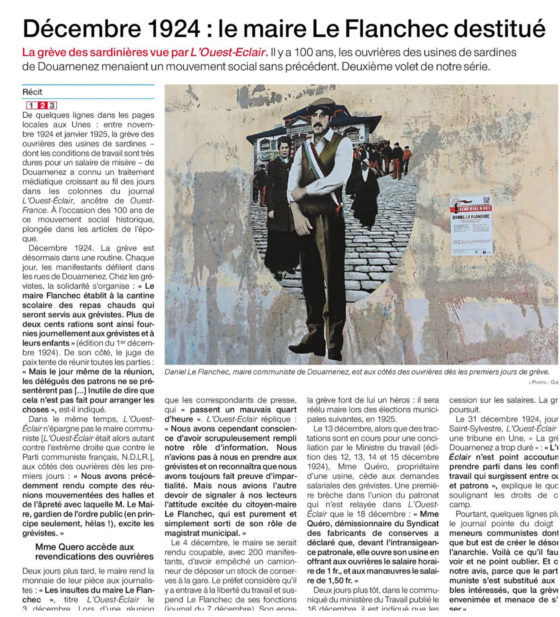 Décembre 1924: Le maire communiste de Douarnenez, Daniel Le Flanchec, destitué pour soutien à la grève des sardinières (Ouest-France, 8 décembre 2024)