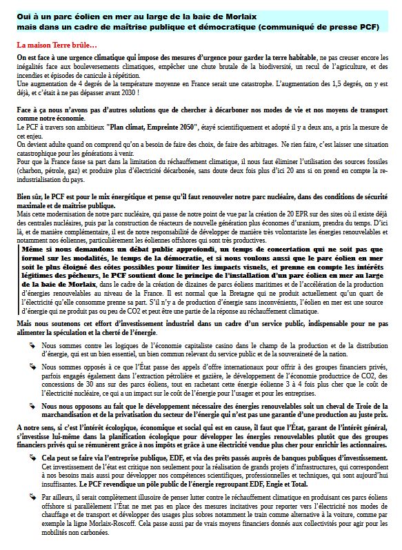 Même si nous demandons un débat public approfondi, un temps de concertation qui ne soit pas que formel sur les modalités, le temps de la démocratie, et si nous voulons aussi que le parc éolien en mer soit le plus éloigné des côtes possibles pour limiter les impacts visuels, et prenne en compte les intérêts légitimes des pêcheurs, le PCF soutient donc le principe de l’installation d’un parc éolien en mer au large de la baie de Morlaix, dans le cadre de la création de dizaines de parcs éoliens maritimes et de l’accélération de la production d’énergies renouvelables au niveau de la France. Il est normal que la Bretagne qui ne produit actuellement qu’un quart de l’électricité qu’elle consomme prenne sa part. S’il n’y a de production d’énergie sans inconvénients, l’éolien en mer est une source d’énergie qui ne produit pas ou peu de CO2 et peut être une partie de la réponse au réchauffement climatique.