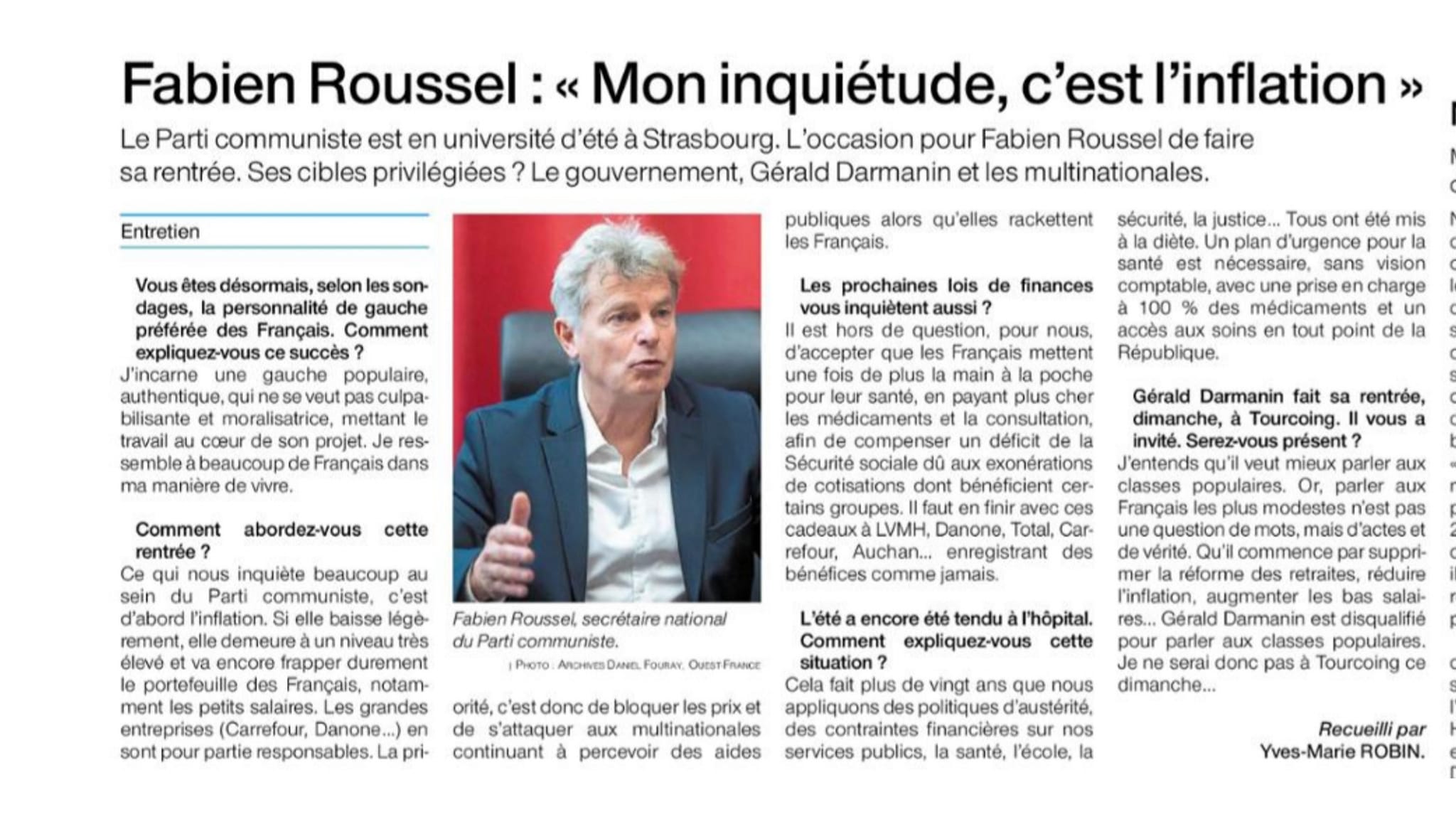 Ouest-France, 26 août. Interview de Fabien Roussel: « Mon inquiétude, c’est l’inflation ».https://www.ouest-france.fr/…/fabien-roussel-ma..