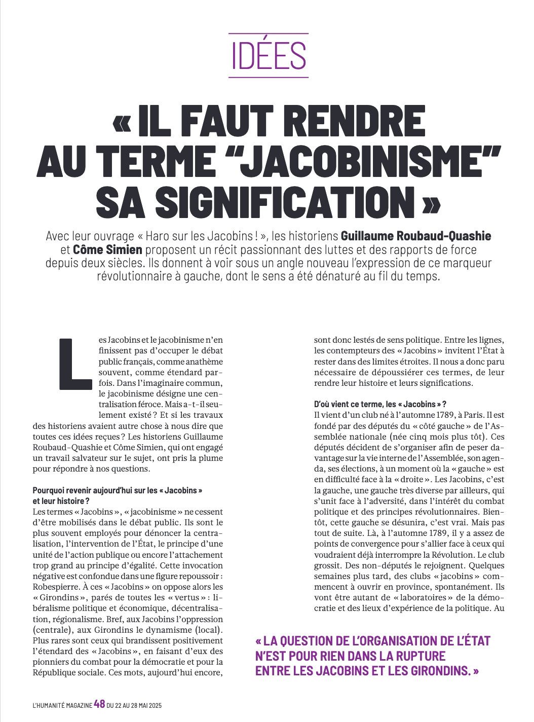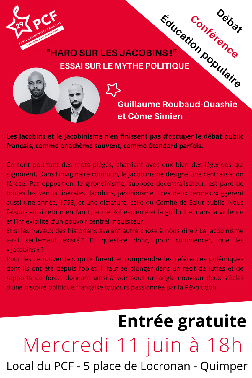 Dans le cadre de nos cycles de conférences-débat d’éducation populaire dans nos sections finistériennes du PCF, les jeunes historiens Guillaume Roubaud Quashie (de surcroît directeur de la revue Cause Commune et de la maison Elsa Triolet et Aragon et dirigeant national du parti) et Côme Simien présenteront leur essai « Haro sur les Jacobins, essai sur un mythe politique », un sujet très actuel: