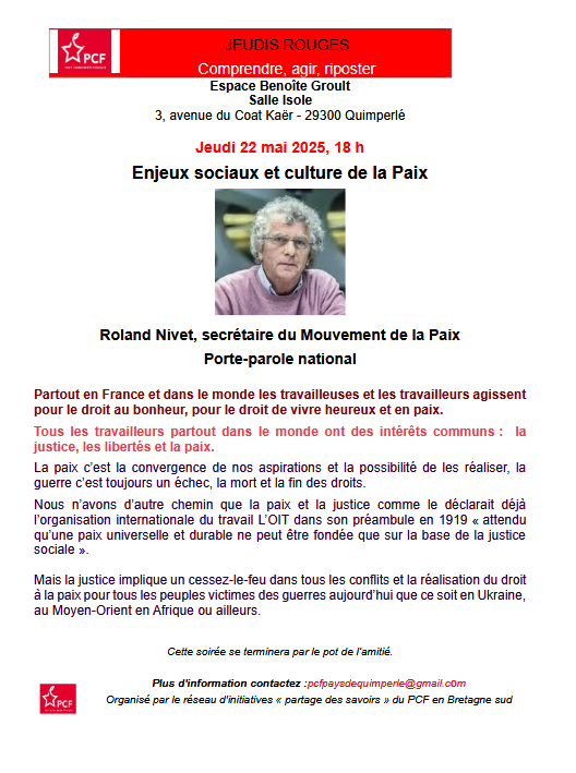 Jeudi 22 mai 2025 – Jeudi Rouge avec Roland Nivet, porte-parole du mouvement de la Paix, à Quimperlé, salle Isole, organisé par le PCF Pays de Quimperlé