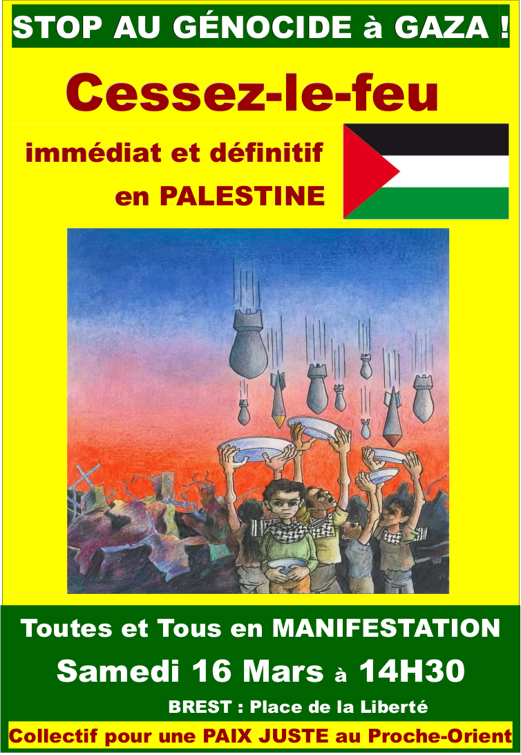La fédération du Finistère du PCF soutient l’appel du collectif « pour une paix juste au proche-orient » à manifester samedi 16 mars à 14 h30 Place de la Liberté à Brest et la manifestation pour un cessez-le-feu à Gaza à Quimper à l’appel d’un collectif unitaire dont le Parti communiste et les Jeunesses communistes font partie. Ce sera samedi 16 mars à 10h30 Place Saint Corentin à Quimper.