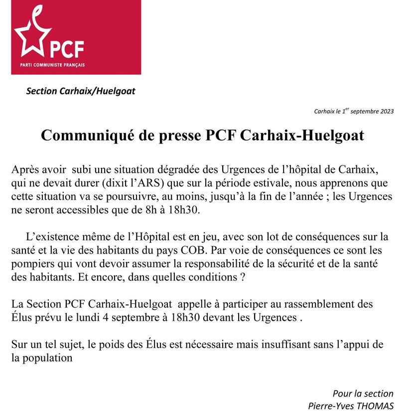 La section PCF de Carhaix-Huelgoat appelle à manifester pour les Urgences de l’hôpital de Carhaix le lundi 4 septembre 2023 à 18h30 devant les Urgences