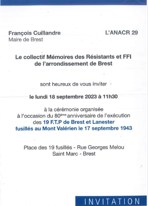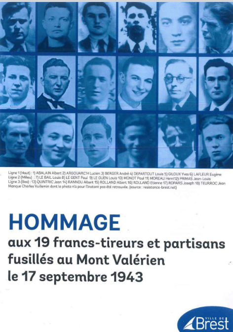 Ces 19 héros, ces 19 camarades communistes brestois et finistériens fusillés au Mont Valérien par l’armée allemande le 17 septembre 1943, étaient:
