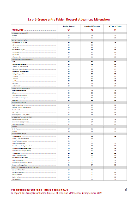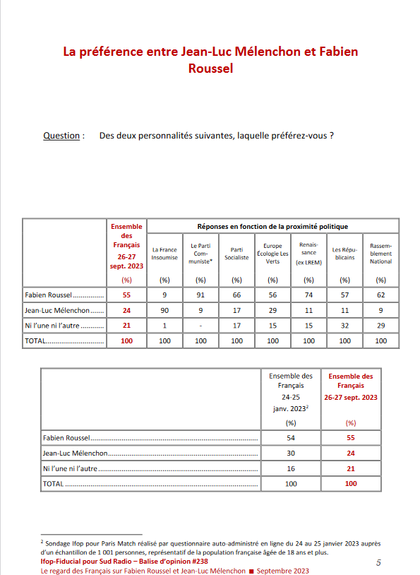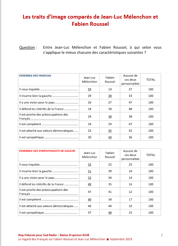 Enquête réalisée auprès de Ifop-Fudicial auprès d’un échantillon de 1004 personnes pour Sud Radio: le regard des français sur Fabien Roussel et Jean-Luc Mélenchon, septembre 2023