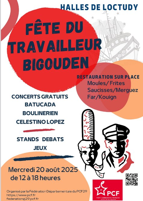 La fête du Travailleur bigouden de Loctudy, c’est mercredi le 20 août, et c’est organisé par le PCF Finistère cette année conjointement avec nos camarades de la section du PCF Pays Bigouden. Notez bien la date dans vos agendas!