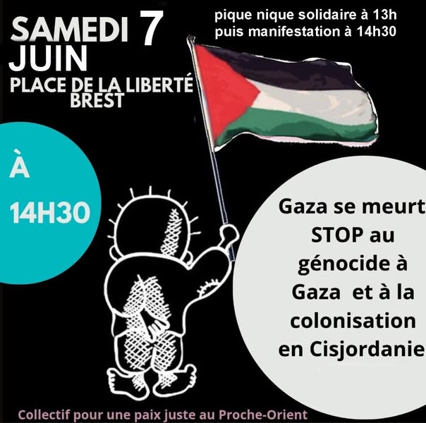 Mobilisés le samedi 7 juin place de la liberté à Brest en solidarité avec Gaza et le peuple palestinien