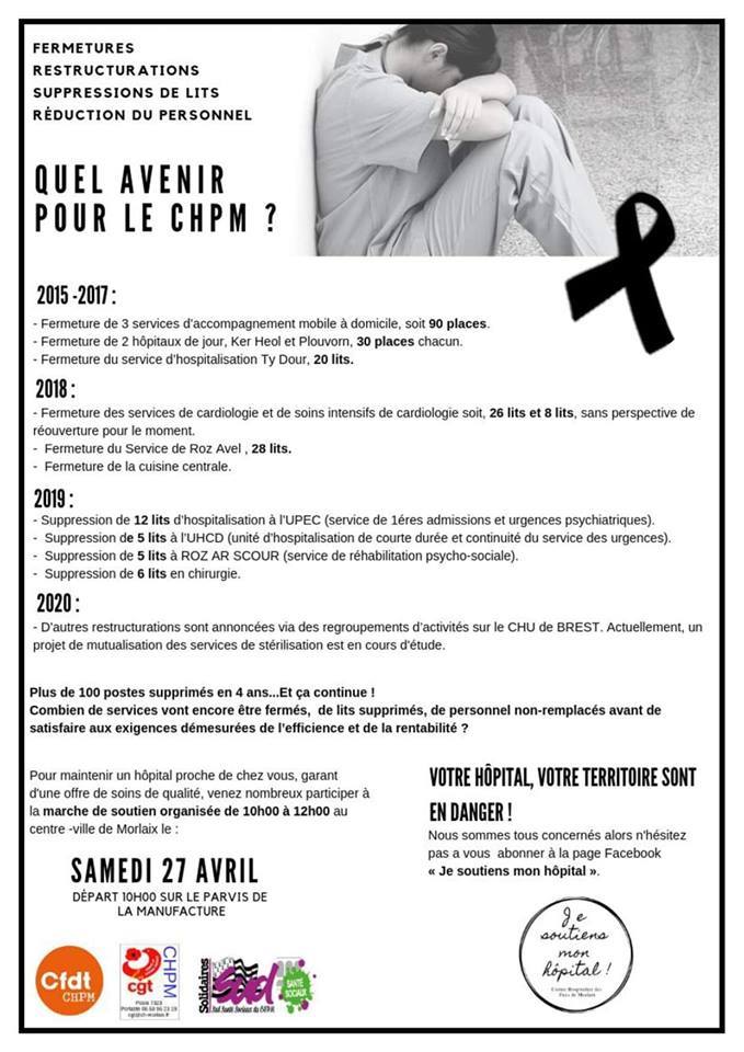 Quel avenir pour le centre hospitalier de Morlaix? – Manif à l’appel de l’intersyndicale CGT, CFDT, SUD le 27 avril à Morlaix – Agents et usagers, tous unis pour la sauvegarde de notre hôpital!