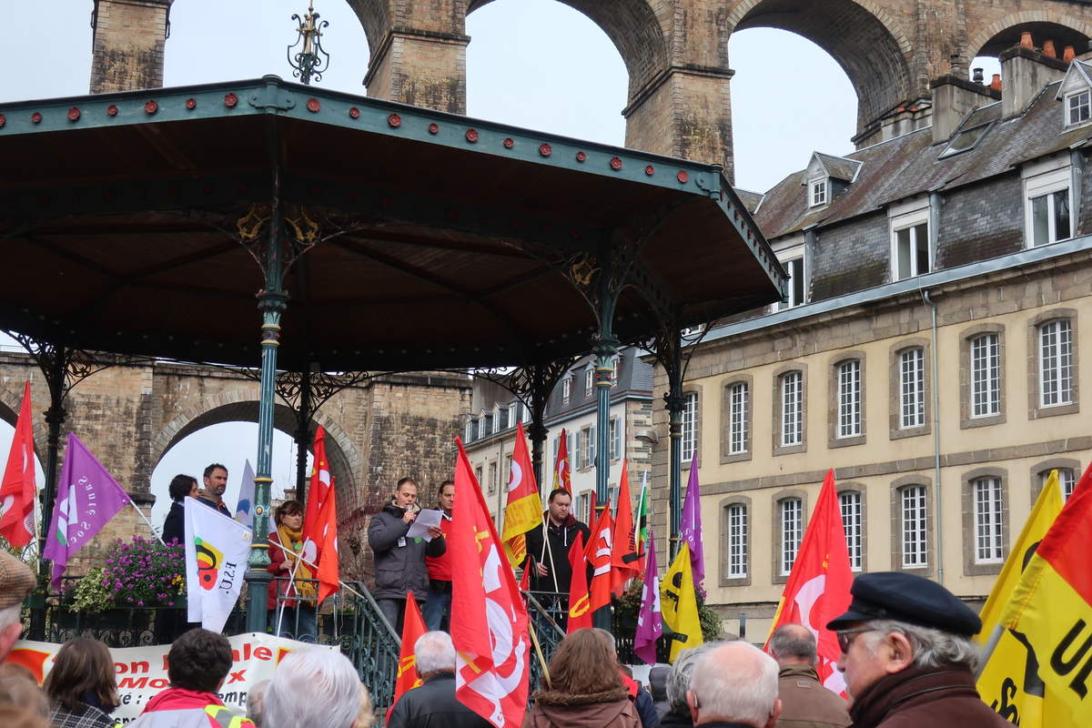 400 manifestants motivés à Morlaix ce mardi 19 mars avec une belle participation des camarades du PCF, des prises de parole toniques de la CGT (Chistophe Boudrot), de Sud-Solidaires (Sébastien Menès), d’une camarade de FO, de la FSU (Antoine Gauchard).