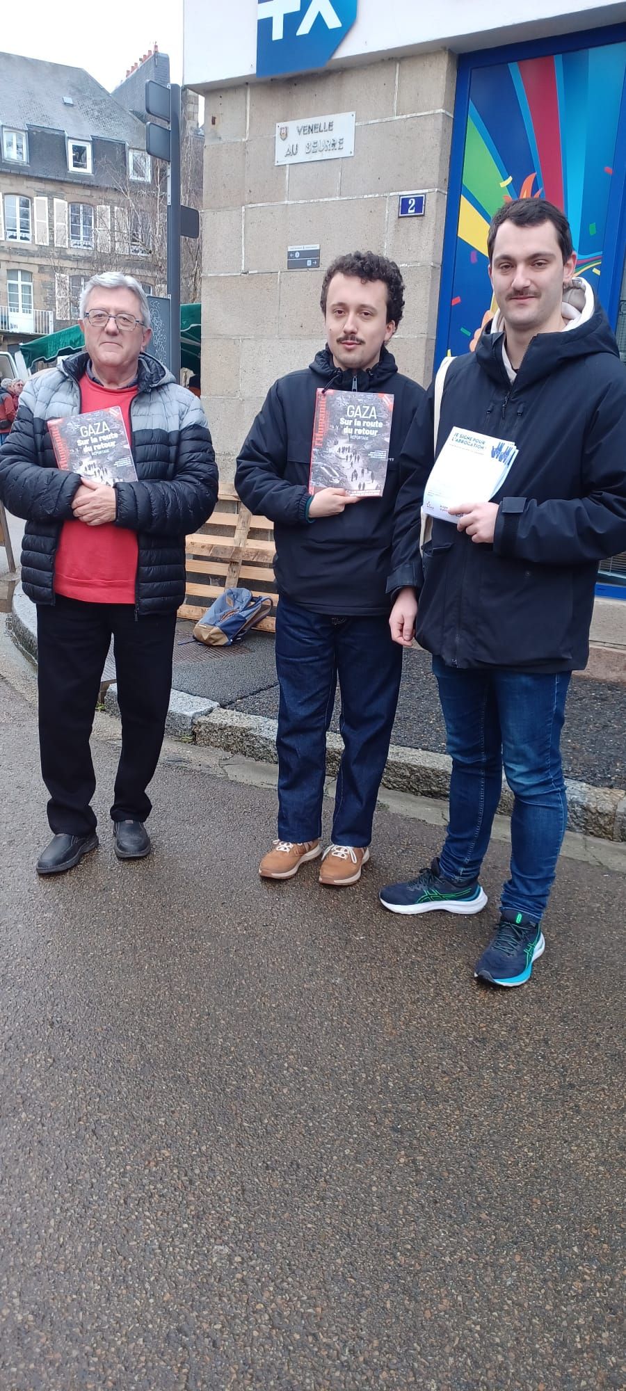 Nos camarades Daniel Ravasio, Paul Mongault et Enzo de Gregorio sur le marché de Morlaix pour vendre l’Humanité magazine avec un dossier spécial Gaza et distribuer un tract national du PCF pour abolir la réforme des retraites Borne Macron. C’était ce matin au même moment que notre vente de légumes solidaire à la vierge noire