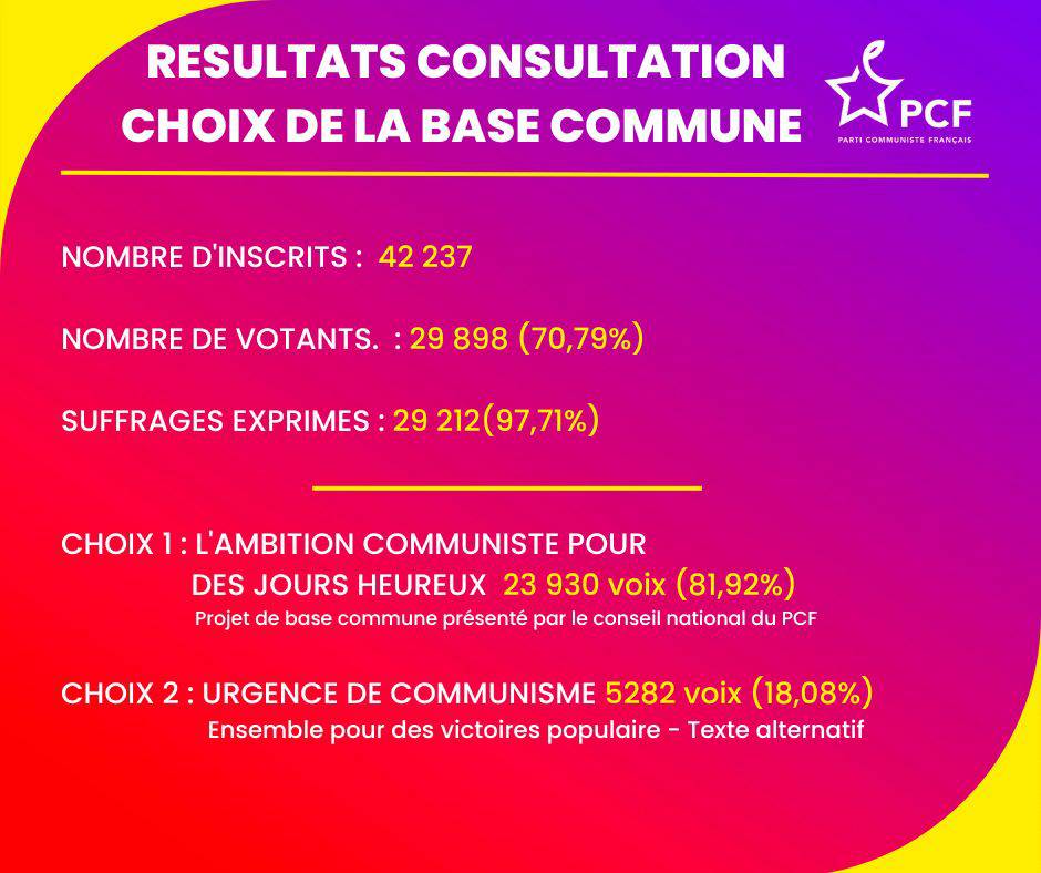 Résultat du vote des communistes pour le choix de la base commune du 39e Congrès du PCF