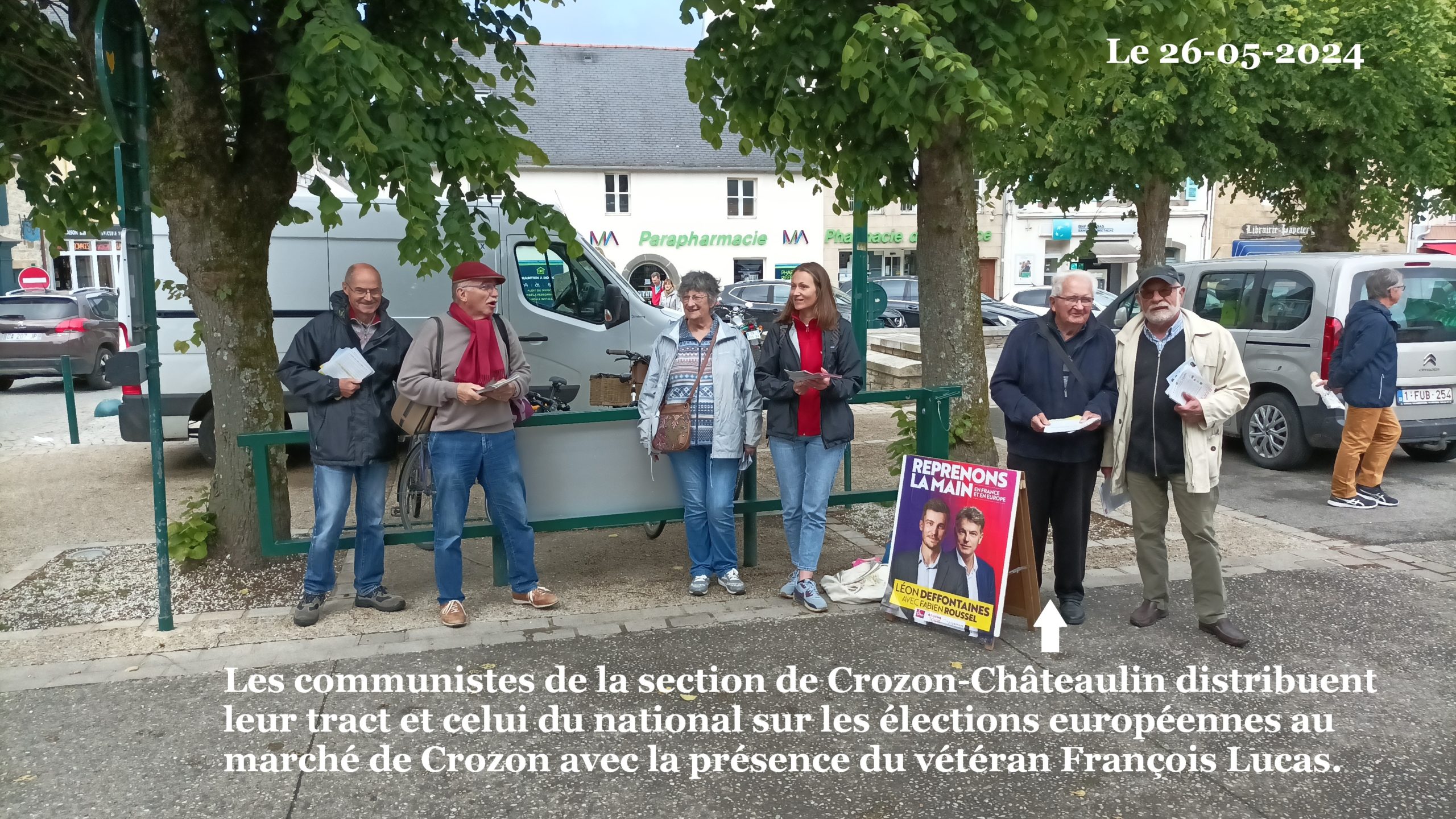 Une section communiste du Finistère pleinement mobilisée pour la campagne de Léon Deffontaines: chaque jour un point de distribution et de rencontres avec les habitants. Ce matin, après la distribution de 400 tracts pour Léon Deffontaines à la base aéronavale de Lanvéoc et une présence au marché de Lanvéoc le vendredi 24 mai, la distribution de 200 tracts au marché de St Nic le mardi 21 mai, les communistes de la section de Crozon-Châteaulin-Pont-de-Buis ont continué le tour des marchés de leur grand secteur d’activité militante avec celui de Crozon et ils ont eu la bonne surprise d’avoir à leurs côtés le vétéran François Lucas venu les aider pour la distribution.