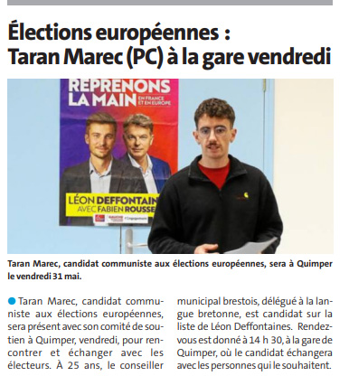 Candidat finistérien sur la liste de Léon Deffontaines et de la Gauche Unie pour le monde du Travail, Taran Marec sera à la gare de Quimper vendredi après-midi, 31 mai, à partir de 14h30, pour dialoguer avec les usagers. Le télégramme.