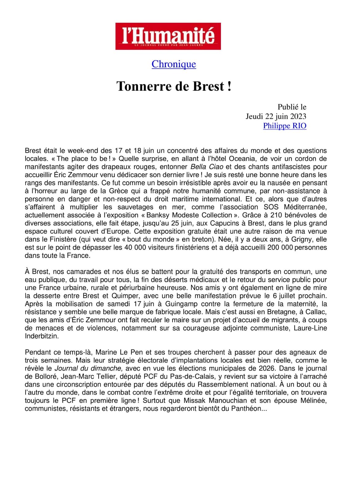 Tonnerre de Brest – La Chronique de Philippe Rio dans L’Humanité du 22 juin 2023