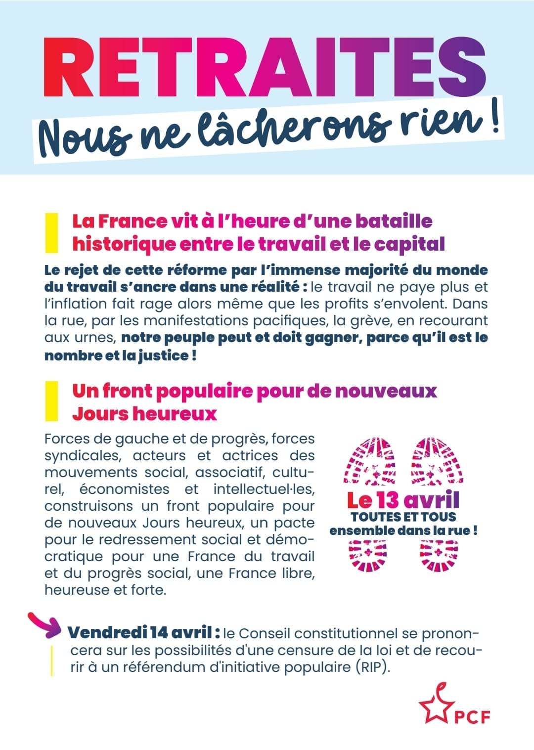 Le 14 avril 2023 le Conseil Constitutionnel rendra sa décision sur la possibilité d’une censure de cette loi retraite et sur l’opportunité d’ouvrir la voie à un référendum d’initiative populaire, suite à la saisine des député.e.s, avec une initiative notamment des députés communistes pour le RIP.