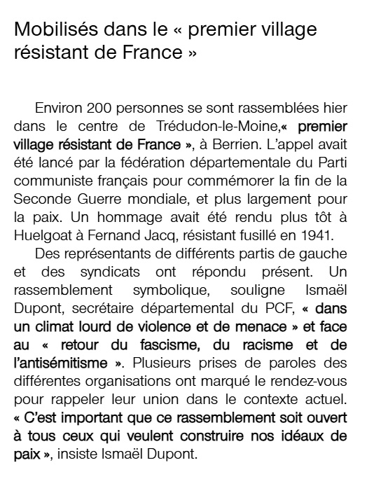 Tredudon-le-Moine, 8 mai 2025: Mobilisés dans « le premier village résistant de France » (Ouest-France, 9 mai 2025)