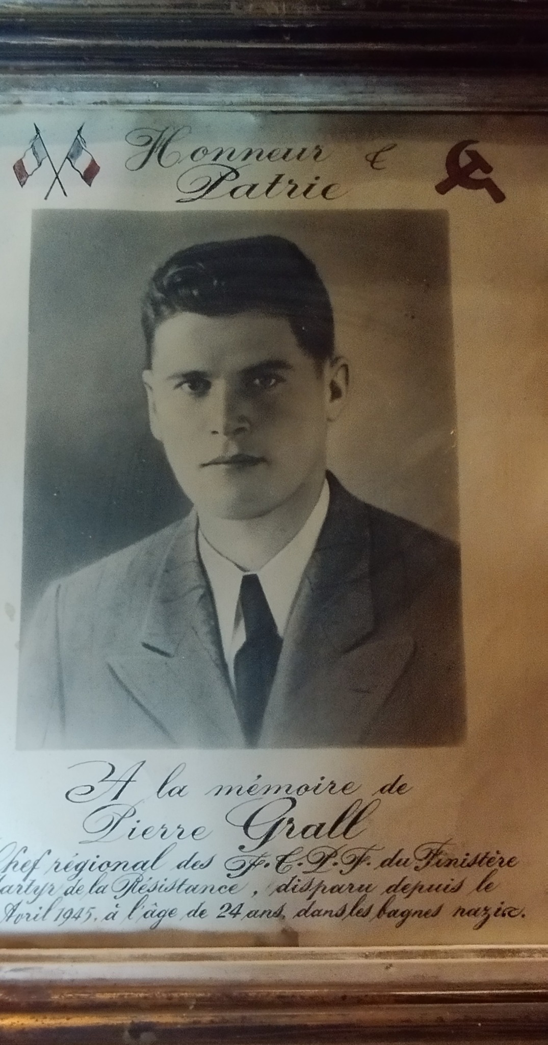 Pierre Grall, arrêté le 5 juin 1944, après avoir servi comme militant communiste dans les FTPF et avoir effectué plusieurs sabotages, attaques, actions armées, qui sera affreusement torturé par les soldats allemands à qui il avait été dénoncé après un parachutage d’armes alliées, et qui mourut en déportation à Dora, le sinistre camp enterré où l’on construisait les fusées secrètes des nazis, les V2 de l’ingénieur Werner Van Braun, qui servit ensuite le programme aérospatial américain pour aller sur la Lune, et n’eut pas de compte à rendre sur sa participation aux crimes contre l’Humanité infligés aux déportés.