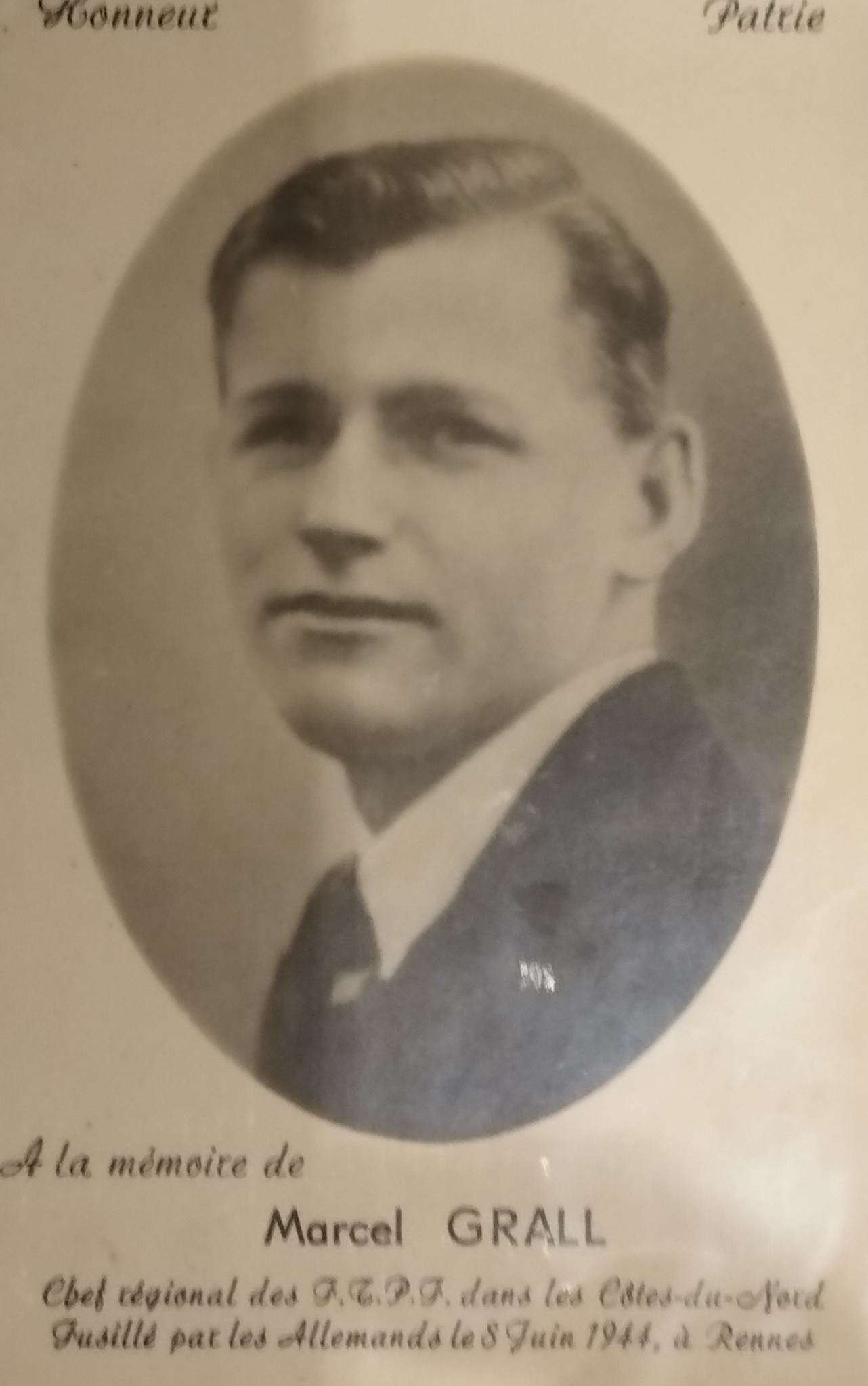 Le frère de Pierre Grall, Marcel Grall, de Berrien lui aussi, agriculteur puis terrassier communiste, dirigeant des FTP de la région du Faou, dénoncé et torturé par la police française avant d’être fusillé en même temps que 28 de ses camarades le 8 juin 1944, 2 jours après le débarquement allié de Normandie.