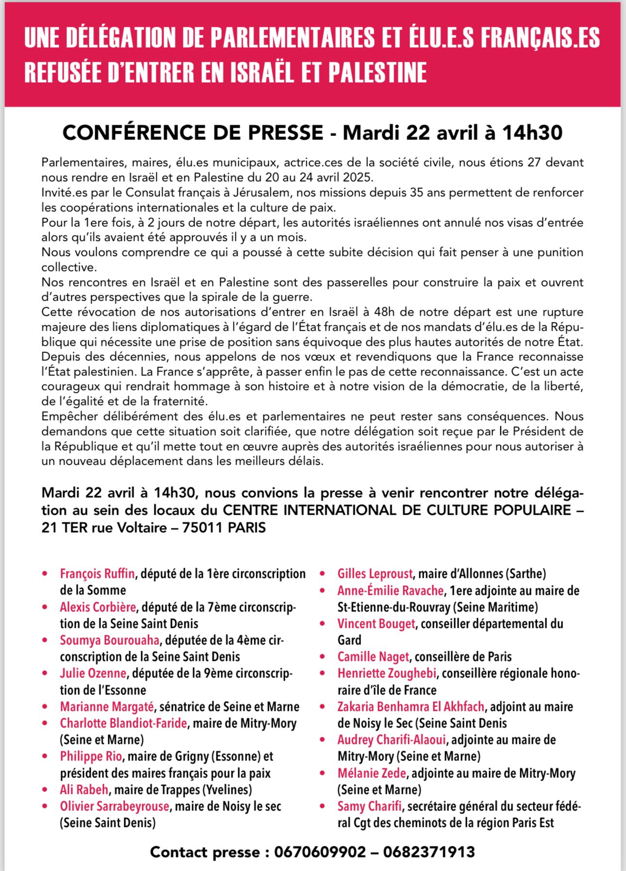 Quelle honte! Une délégation d’elu.e.s, de parlementaires de gauche avec Ruffin, Corbière, les parlementaires communistes Soumya Bourouha et Marianne Margaté, et d’autres camarades élus du PCF comme Vincent Bouger, Philippe Rio, Camille Nager, Charlotte Blandiot Faride maire de Mitry Mory et présidente de l’AJPF, Gilles Leproust, interdite d’accès en Israël par le même gouvernement qui a accueilli en grande pompe Jordan Bardella représentant d’un parti héritier de la collaboration et de l’antisémitisme d’extrême-droite.