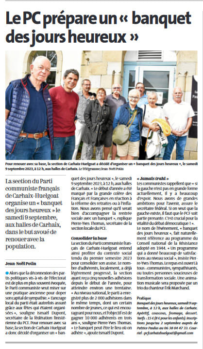 Carhaix – Le PC prépare un banquet des Jours Heureux le 9 septembre (Le Télégramme, 26 août 2023)