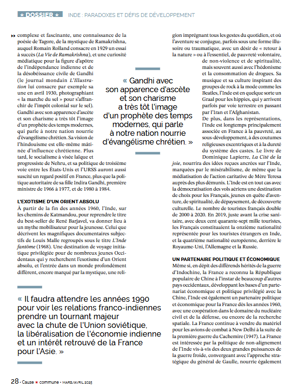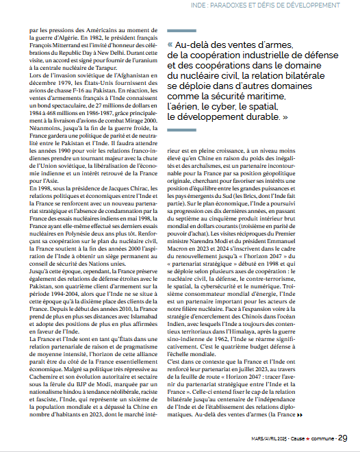 Entre la France et l’Inde, une relation ancienne, des enjeux d’avenir – Un article d’Ismaël Dupont dans la revue Cause Commune, mars-avril 2025