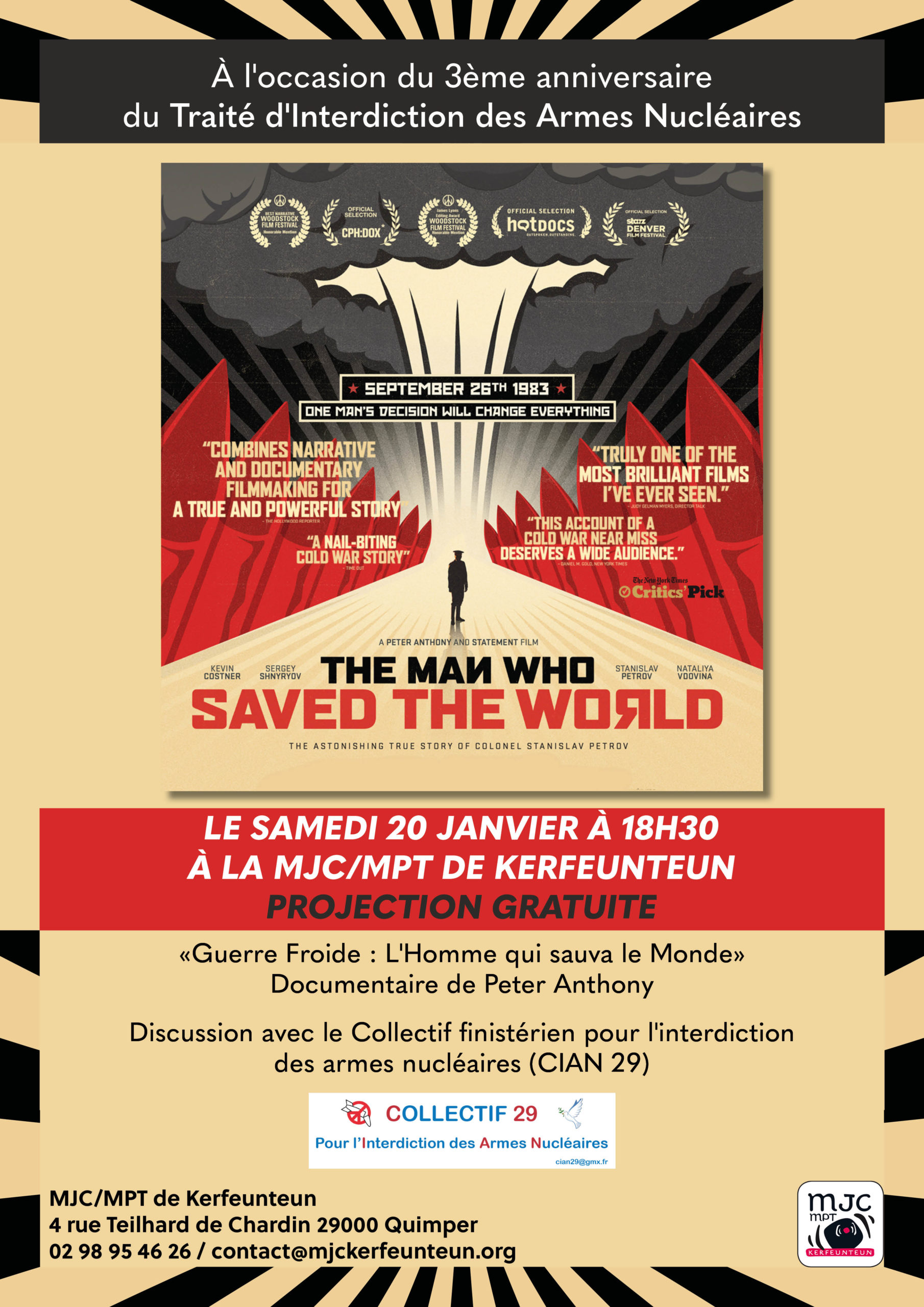 samedi 20 JANVIER, à la MJC-MPT de Kerfeuteun à 18h30 une soirée-débat organisée par le CIAN 29 – collectif finistérien pour l’interdiction des armes nucléaires dont fait partie le PCF – avec la projection du film « Guerre froide : L’homme qui sauva le Monde » suivie d’un débat.