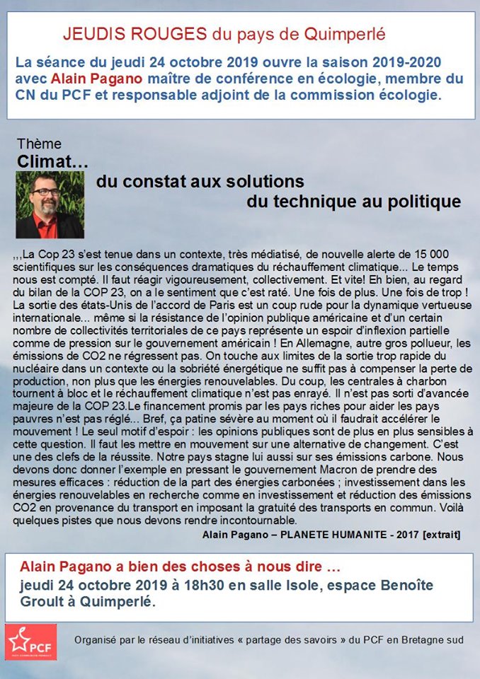 Soirée détonante et décoiffante pour Les Jeudis Rouge le 24 octobre à Quimperlé. 35 personnes pour débattre avec Alain Pagano (enseignant chercheur en écologie à la fac d’Angers et responsable de la Commission Ecologie du PCF) des changements climatiques et des actions à conduire. Des communistes certes mais une majorité de non communistes, des …