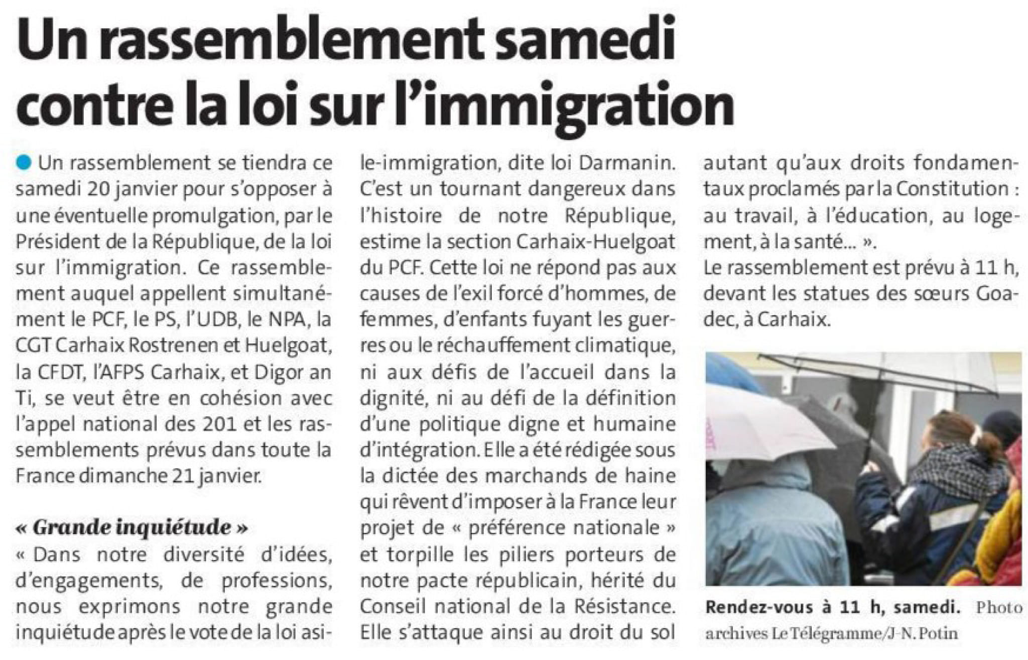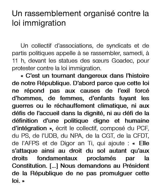 Samedi à Carhaix, mobilisation contre la loi immigration, 11h, devant les statues des soeurs Goadec, avec le PCF Carhaix-Huelgoat et un collectif de partis, d’associations, de syndicats. Dans la presse du jour: Télégramme et Ouest-France.